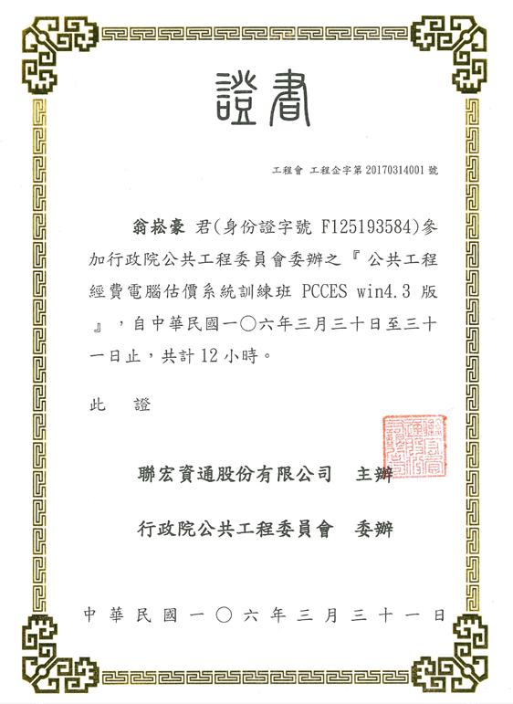 公共工程經費電腦估價 系統訓練班PCCES證書