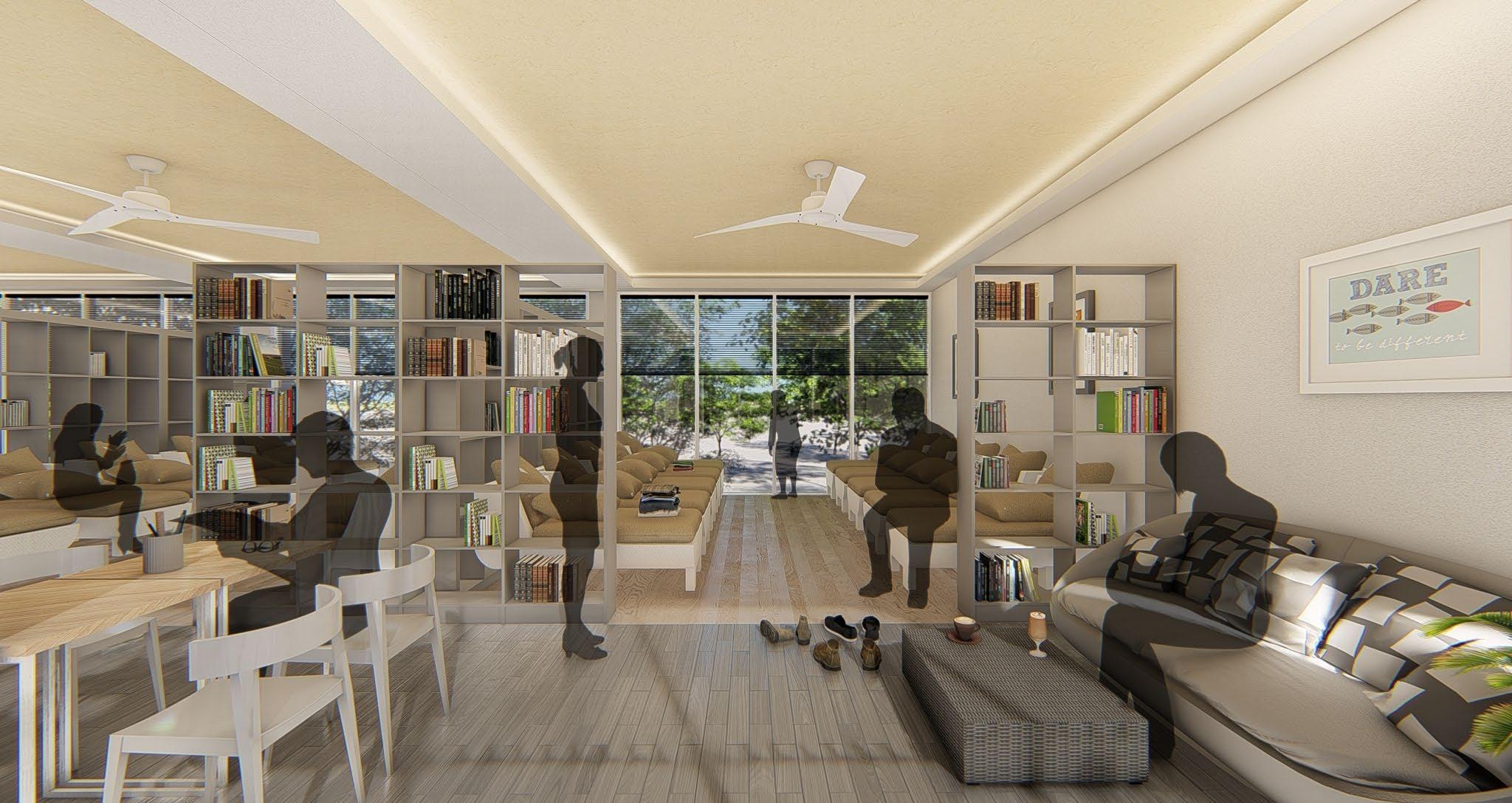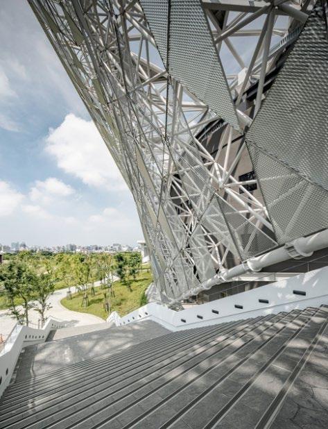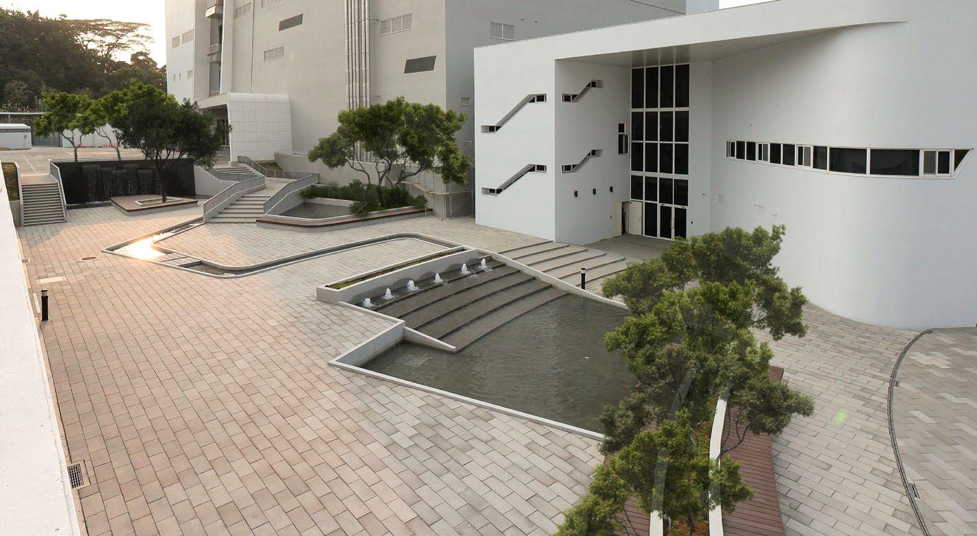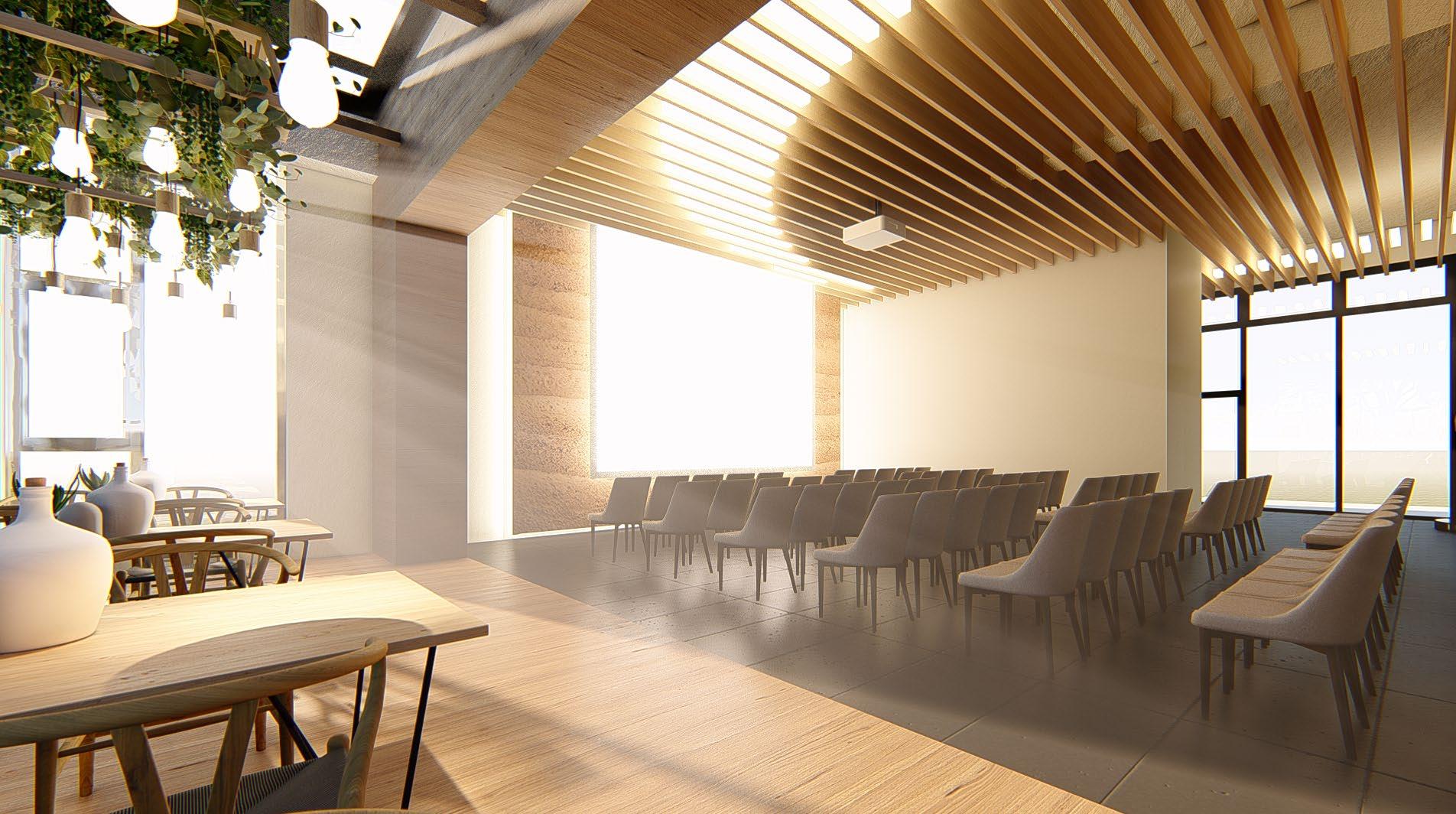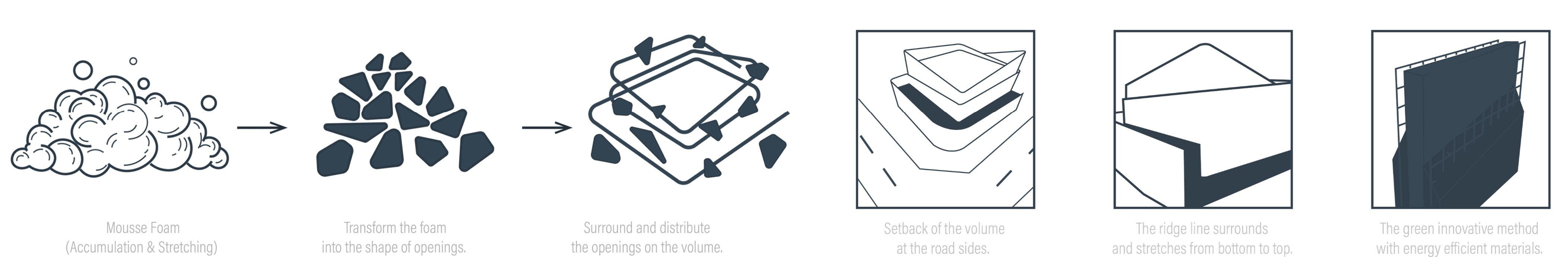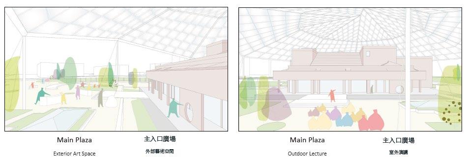 我們以“空間封裝”作為設計 概念,用下列設計手法: 音、風、光 採輕質吸音材料以減少空間 殘響與迴聲,延伸空調管線 採側面出迴風的對流系統, 南面採光,自然光線充足, 人造光源補強重點造型。