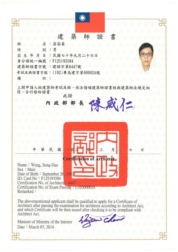 證書,曾經以 專案建築師 身分為事務所取得 會展中心 、 市場 、 商
