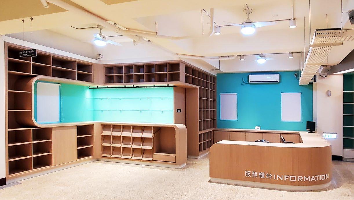 服務積木BOX :利用木質 箱櫃如同積木般的堆疊串接, 組合櫃台與書櫃與期刊展示 空間,呈現空間整體性。