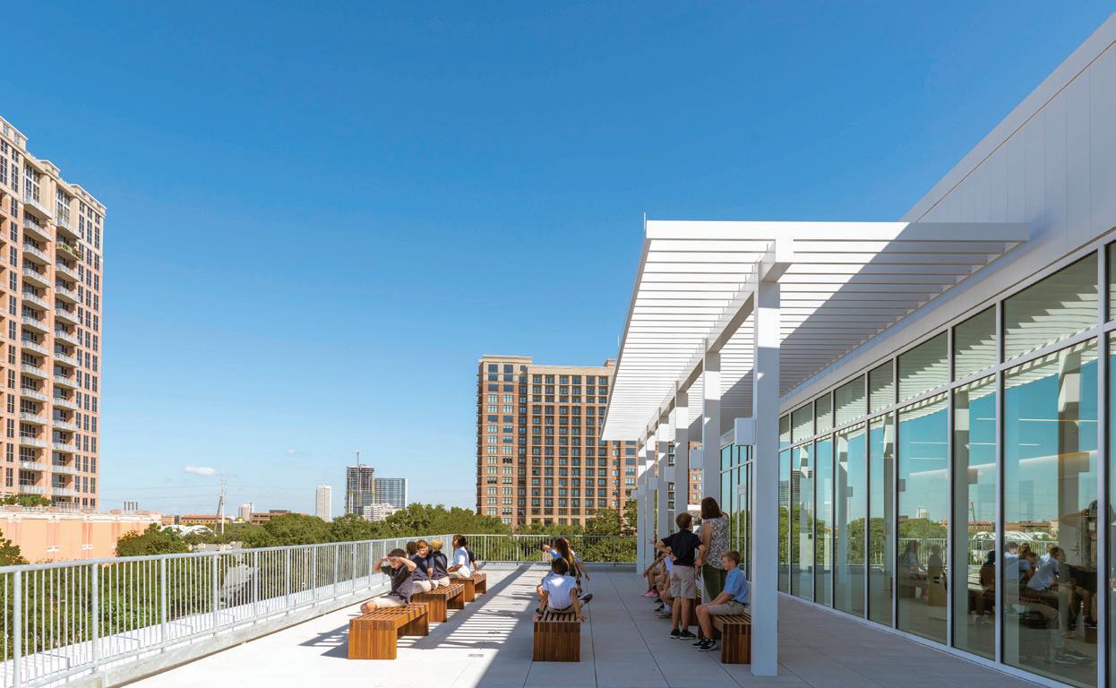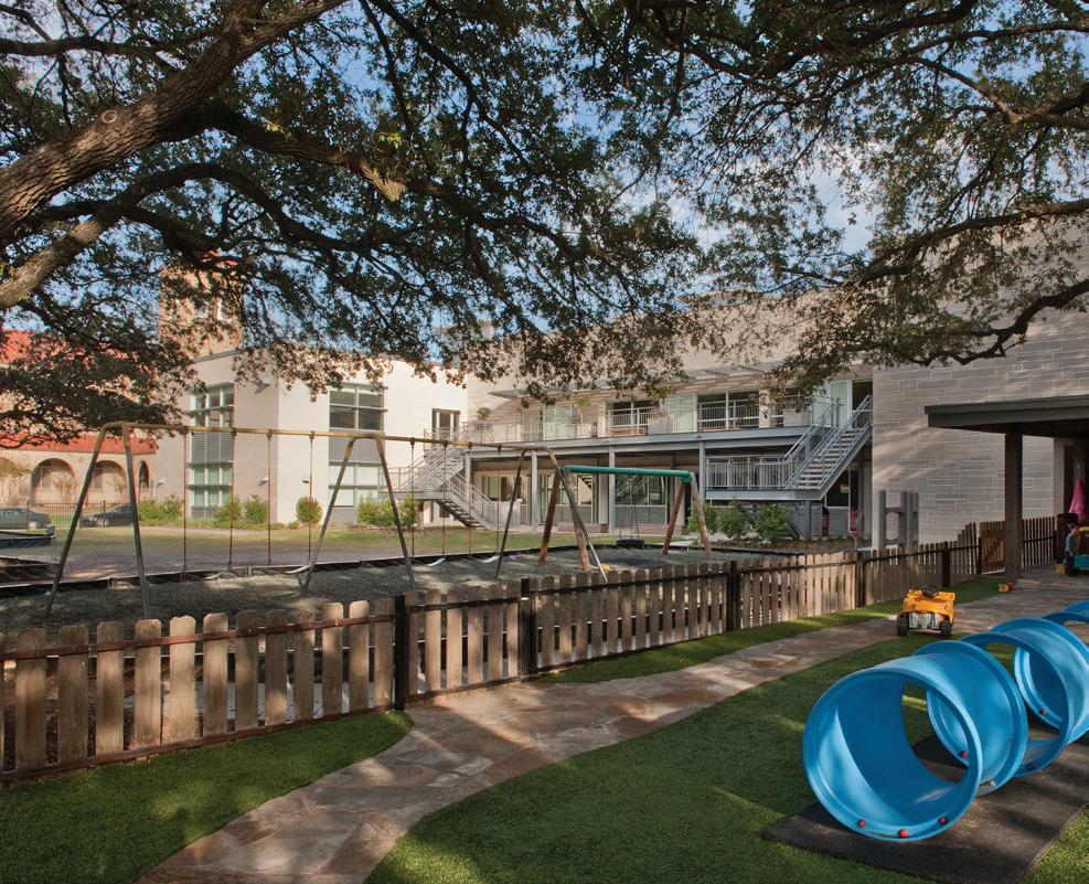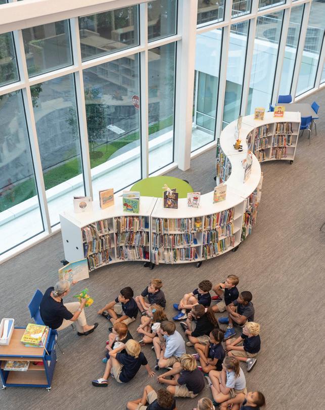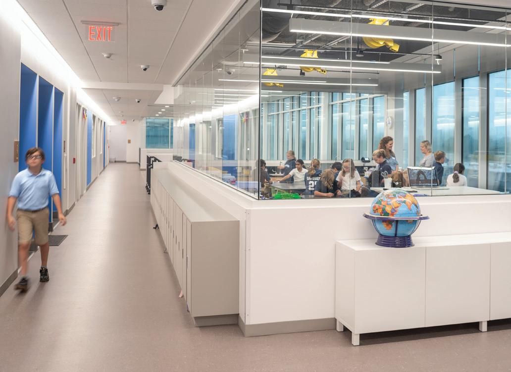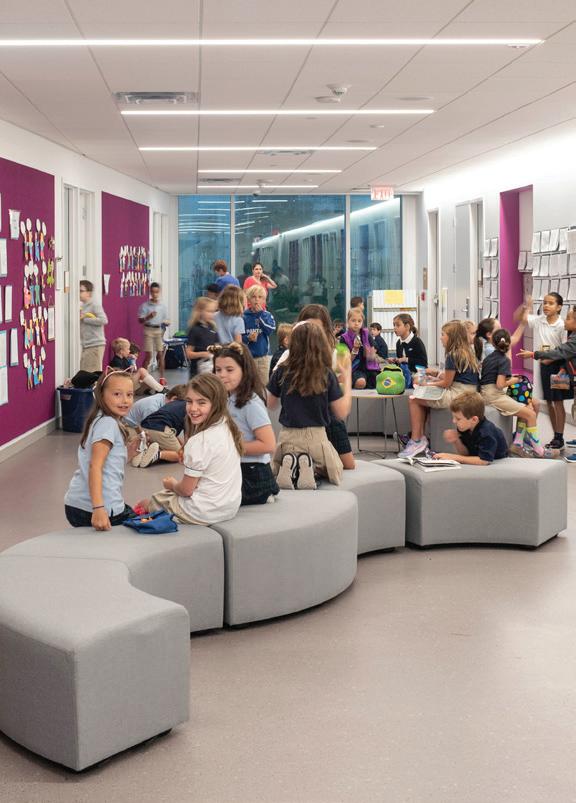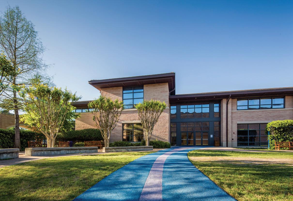 The three-story 46,000-SF Early Childhood and Lower School features indoor areas opening to outdoor play and classroom spaces as well as collaborative spaces that encourage critical and creative thinking. The sweeping staircase located at the entrance is perhaps one of the most eye-catching features of the School. Not just for traveling from one floor to the next, the staircase is also used as learning space and for chapel, parent education, and social events. Formerly located in the main building, a welcome/check-in center greets people upon entering the new building. Additional amenities include two terraces and an outdoor play area outfitted with turf and a playground. The terraces often function as a fun alternative for learning spaces and are also utilized for chapel and special events. The first floor is dedicated to pre-K 3, pre-K 4, and kindergarten as well as the admission offices and the Health Clinic. The second floor includes second grade classrooms, administrative space, and a state-of-the-art music room with sound-absorbent ceilings and walls. The third floor houses the headmaster’s office, academic enrichment department, counselor’s office, learning commons/library, business offices, and third and fourth grade classrooms. The fourth floor is dedicated to the innovation lab, art room, science lab, and fifth grade classrooms.
