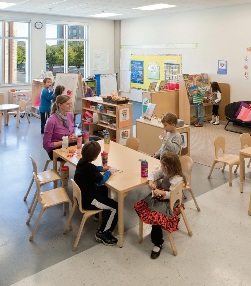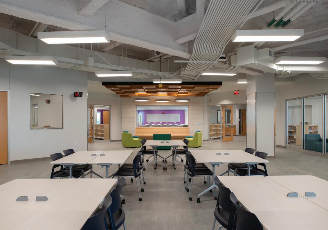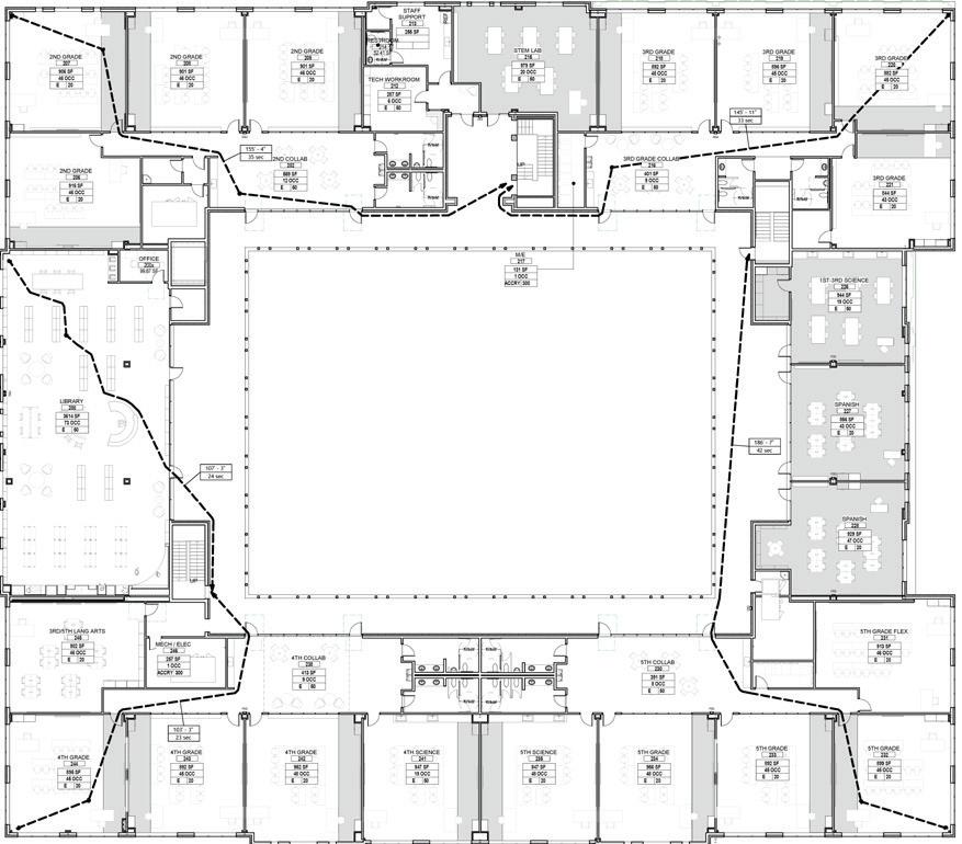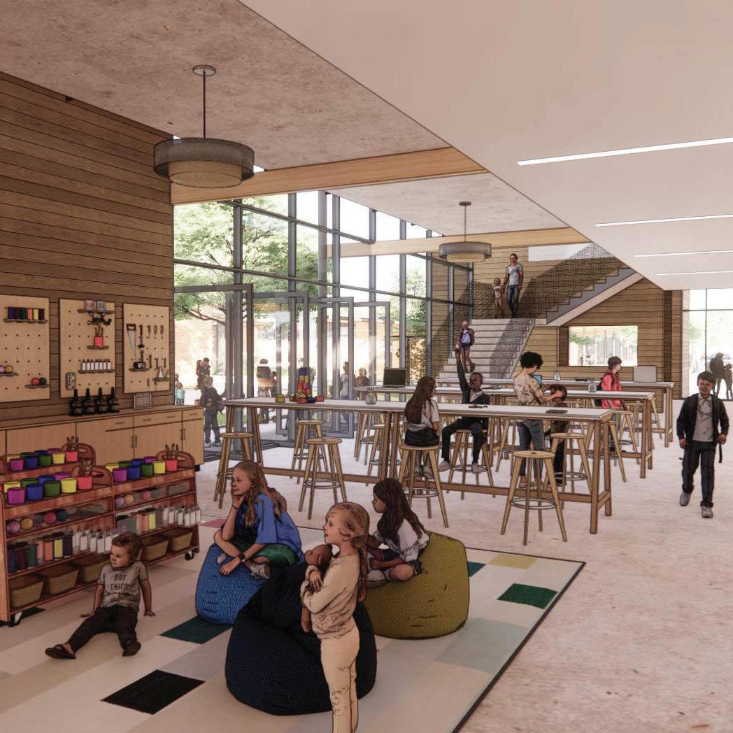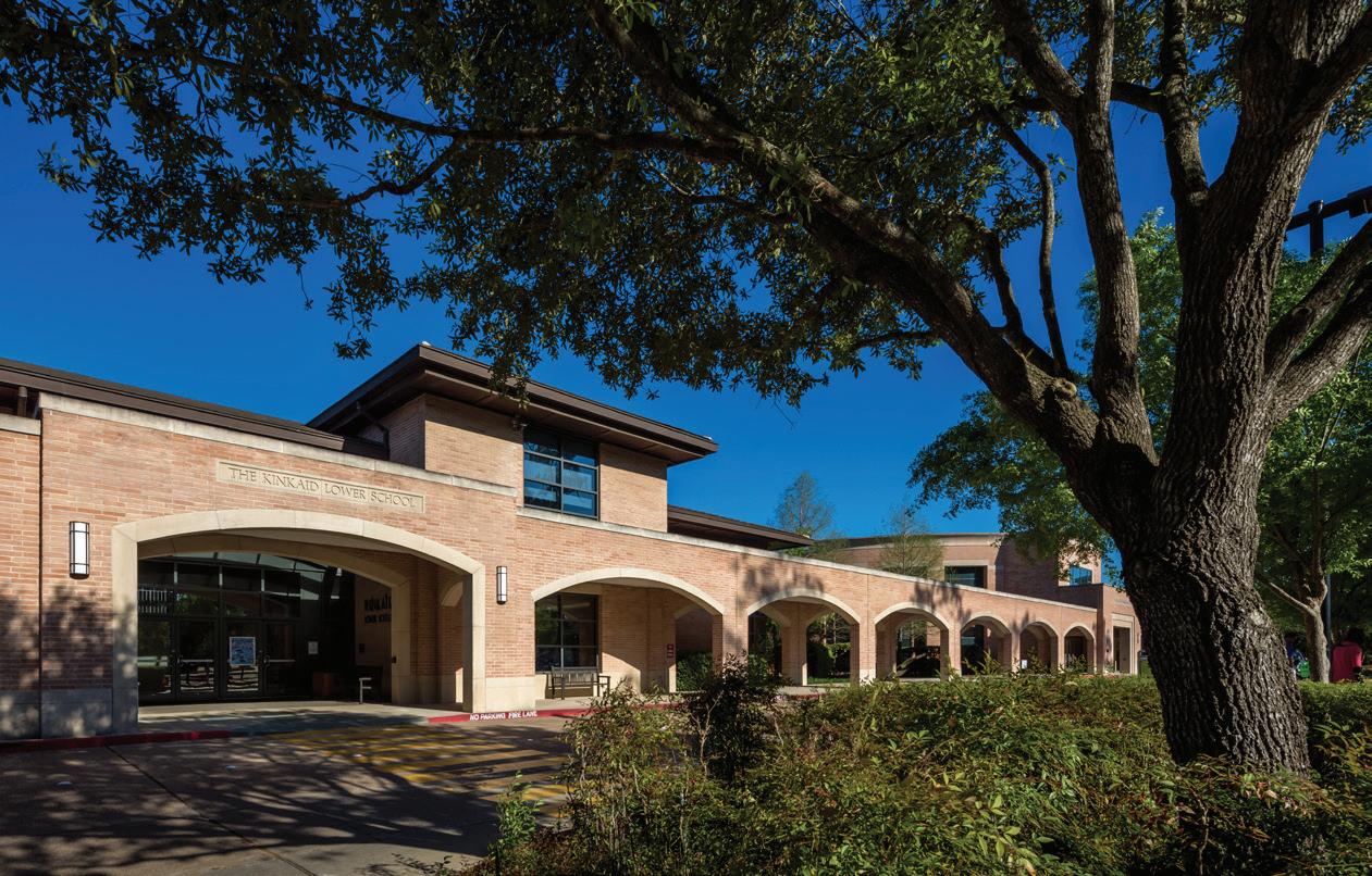The three-story 46,000-SF Early Childhood and Lower School features indoor areas opening to outdoor play and classroom spaces as well as collaborative spaces that encourage critical and creative thinking. The sweeping staircase located at the entrance is perhaps one of the most eye-catching features of the School. Not just for traveling from one floor to the next, the staircase is also used as learning space and for chapel, parent education, and social events. Formerly located in the main building, a welcome/check-in center greets people upon entering the new building. Additional amenities include two terraces and an outdoor play area outfitted with turf and a playground. The terraces often function as a fun alternative for learning spaces and are also utilized for chapel and special events. The first floor is dedicated to pre-K 3, pre-K 4, and kindergarten as well as the admission offices and the Health Clinic. The second floor includes second grade classrooms, administrative space, and a state-of-the-art music room with sound-absorbent ceilings and walls. The third floor houses the headmaster’s office, academic enrichment department, counselor’s office, learning commons/library, business offices, and third and fourth grade classrooms. The fourth floor is dedicated to the innovation lab, art room, science lab, and fifth grade classrooms.
