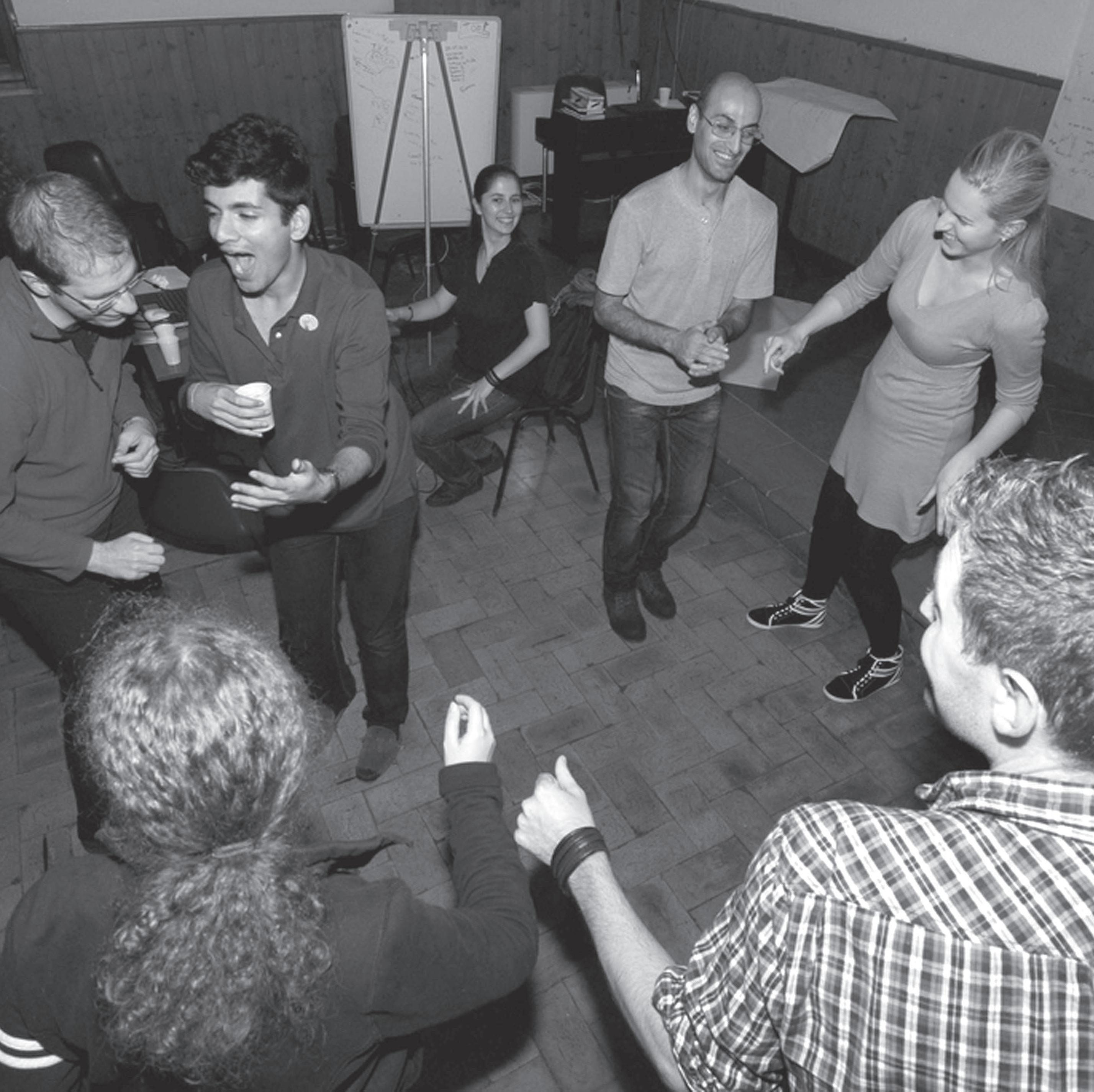 Young people are playing in a lunchroom during an interfaith conference (Who is my Neighbour: Migration and Xenophobia in Europe) in Velletri, Italy. The games are fast, the commands of the leader are short and strict. Some „gentle aggressivity” is in the air. Everybody is laughing at small misunderstandings – funny language barriers are unavoidable in such a workshop.