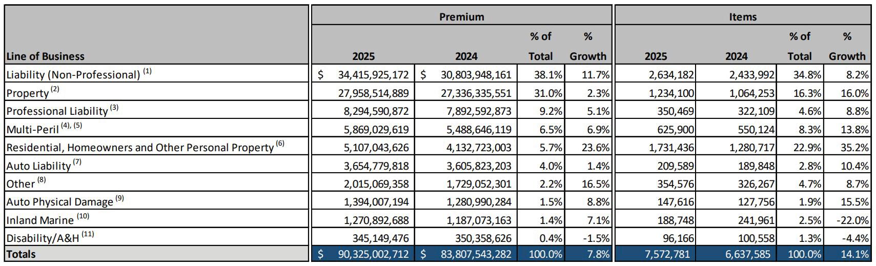 • Total surplus lines premium reported to the stamping offices was $90.3 billion for calendar year 2025, representing a 7.8% increase over 2024.