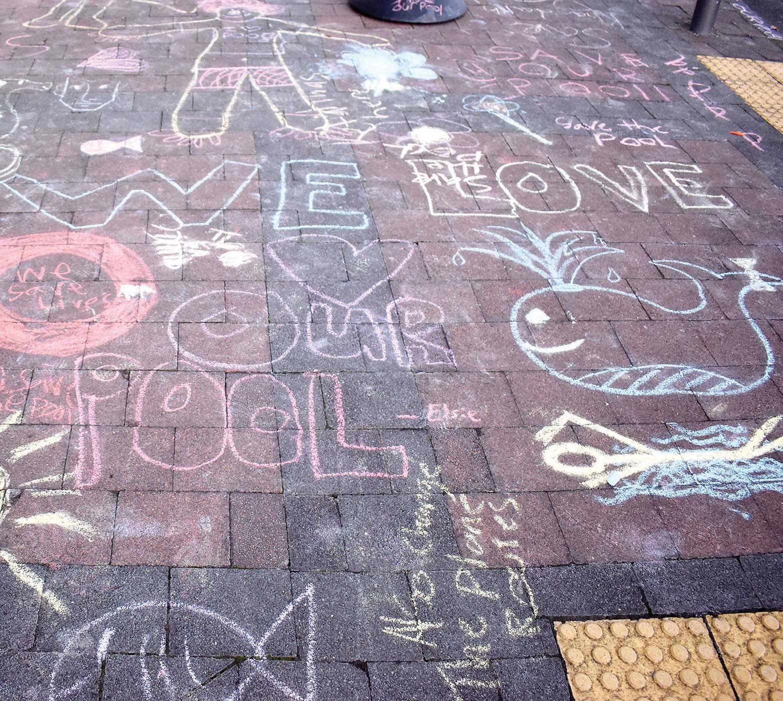 children were using chalks to create artwork and Save the Pool messages on the footpaths outside the town hall.
