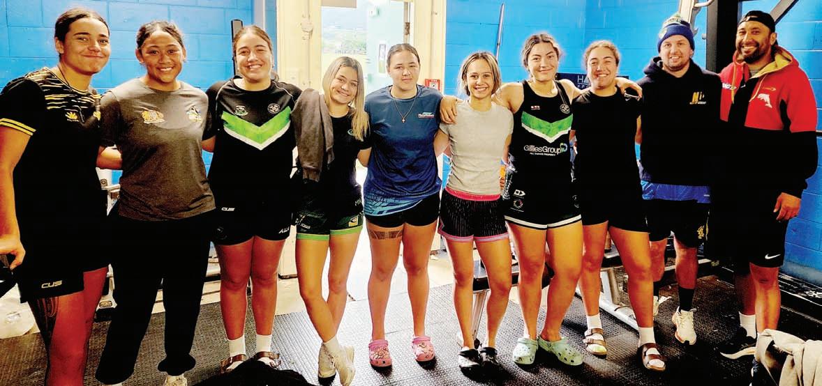 The seven Rugby League players who travelled to Australia last week, along with a friend and their two coaches (from left) Rangitiare Graham, Mia Ualesi, Talia Mapakaitolo, Mariah Nicholls, Ryshia Leota, Hoana Hohepa, Kyla Mere Pasene, Maia Mapakaitolo and coaches Thomas Kiwara and Chris Fox. Photo: Supplied.