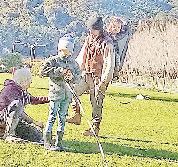 Putting stakes in the ground for the new ngahere korowai (from left) one of the project’s organisers Molly Melhuish, the project’s gardener Shobita Jones of Nature’s Villa (right) and two tamariki. Photo: Pam Crisp.