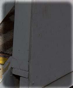 Friends Who Care Chair Linda Olsen standing on a very rickety staircase that is going to be repaired. Photo: Frank Neill.