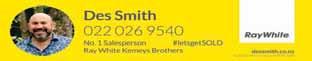 Proudly supported by Des Smith 022 026 9540 No. 1 Salesperson Ray White Kemeys Brothers #letsgetSOLD dessmith.co.nz Kemeys Brothers Ltd Licensed (REAA 2008)