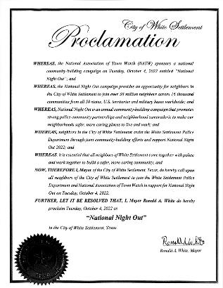Providing exceptional public safety services to our community is one of our core values for the City of White Settlement We have a dedicated police department that knows the meaning of serving and protecting As Mayor Pro Tem, I am proud of the great things that are being accomplished by our police team. Whether it's daily interactions with community members, enforcing our traffic laws, or tracking down those who would do harm to our city, I know that our residents are in great hands with Chief Cook at the helm, along with the dedication and teamwork of our police employees.