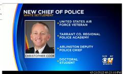 On behalf of our team at the White Settlement Police Department, I want to welcome you to our 2023 Annual Report. I am so humbled to serve as your Chief of Police Your hometown police department has accomplished many great things over the past year. This report is a testament to the dedication and commitment that your police officers, dispatchers, detectives, and professional staff team members represent every single day.