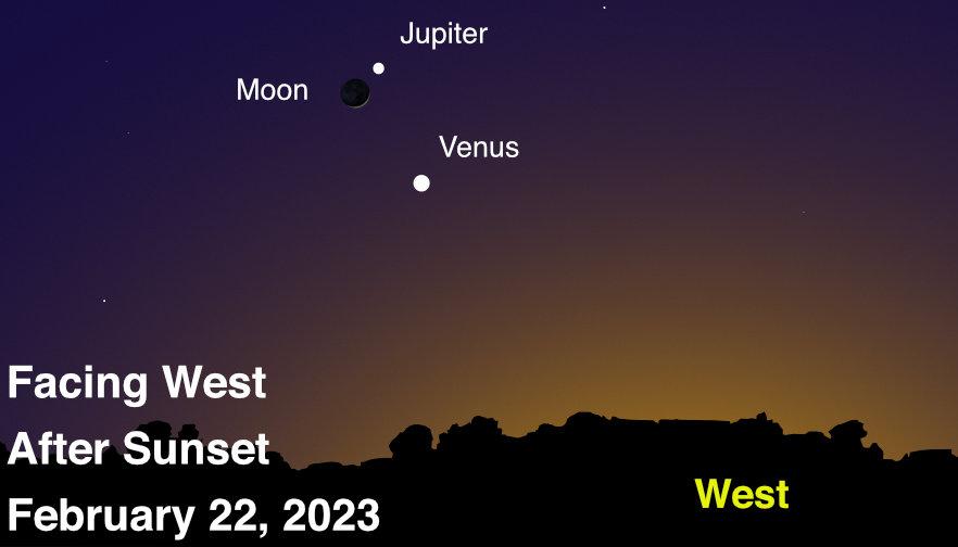 Look for Jupiter as it forms one of the points of a celestial triangle, along with Venus and a very thin crescent Moon, the evening of February 22, 2023. This trio consists of the brightest objects in the sky – until the Sun rises! Binoculars may help you spot Jupiter’s moons as small bright starlike objects on either side of the planet. A small telescope will show them easily, along with Jupiter’s famed cloud bands. How many can you count? Keep watching Jupiter and Venus as the two planets will continue to get closer together each night until they form a close conjunction the night of March 1. Image created with assistance from Stellarium.