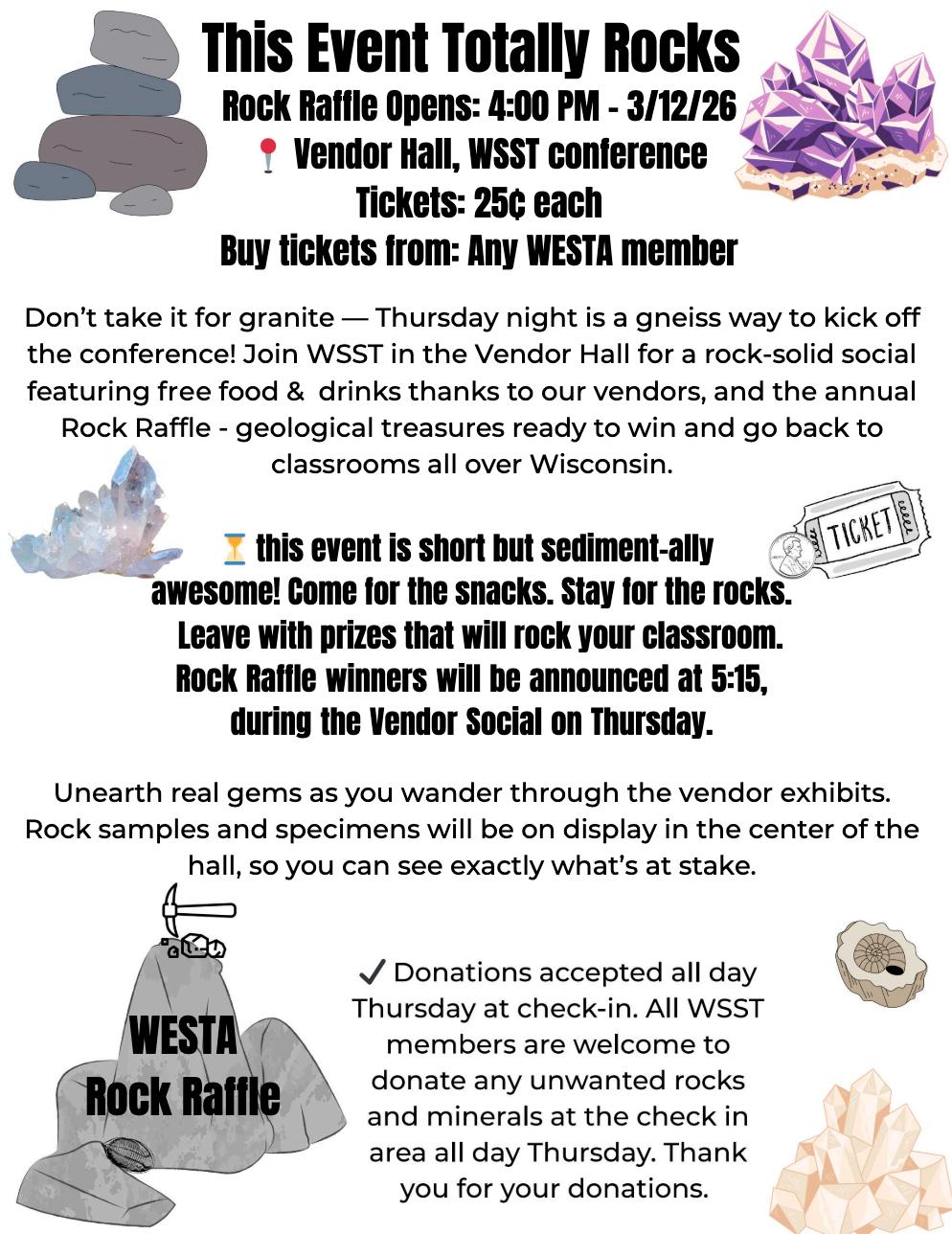 AtsomepointbyFridayafternoon,savetimetocheckoutthevendorhalland talktothemanyvendorswhoarethere.ThebesttimetodothisisduringtheVendor SocialonThursdayfrom4–6pm,withcomplimentaryhorsd’oeuvresandbeverages availableforconferenceattendees.AlsocheckouttheWorldFamousRockRaffle, alsoduringtheVendorSocial,withwinnersannouncedat5:30pm.Makesuretopick upandfilloutthevendorcard,foundattheWSSTboothintheVendorHall.Your missionistocollectstampsfromthevariousvendorsfordifferentcategories,and turnitbackinattheWSSTboothintheVendorHallby3pmFridayafternoontobe eligibleforprizes.Youcouldliterallygohomewithaprizeworthmorethanyour conferenceregistration!AftertheVendorSocial,makeyourwaytotheMember Socialtoenjoymorefoodandfunwhilemeetingnewpeopleandreconnectingwith others,wheretherewillbemoredoorprizes!