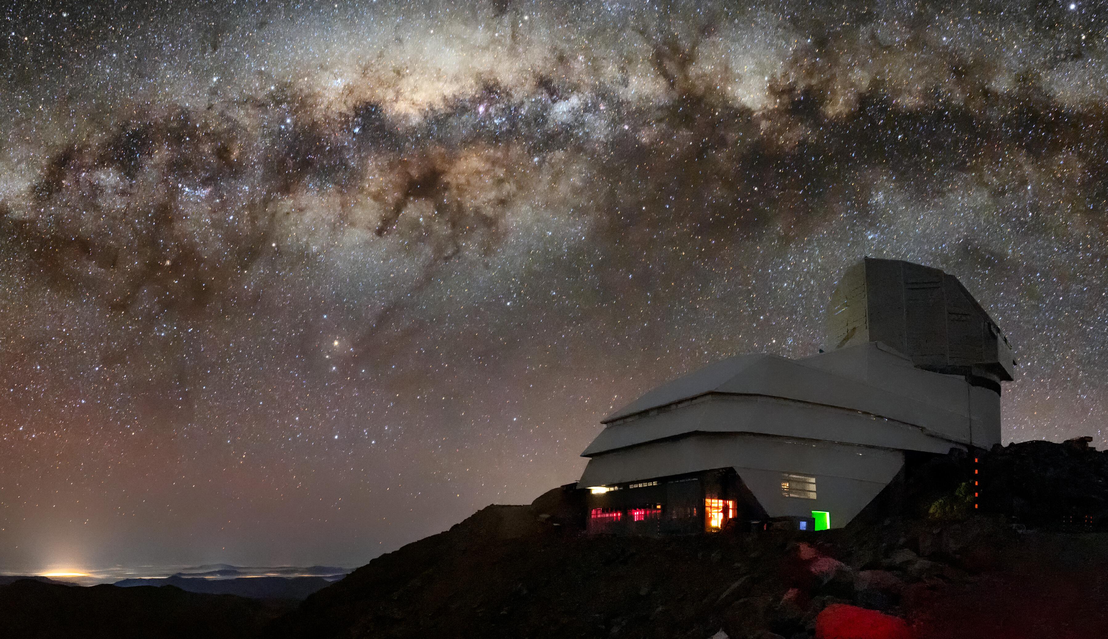 Rubin Observatory, located at Cerro Pachón, Chile, under the Milky Way. The bright halo of gas and stars on the left side of the image highlights the very center of the Milky Way galaxy. The dark path that cuts through this center is known as the Great Rift, because it gives the appearance that the Milky Way has been split in half. Image Credit: RubinObs/NOIRLab/SLAC/NSF/DOE/AURA/B. Quint