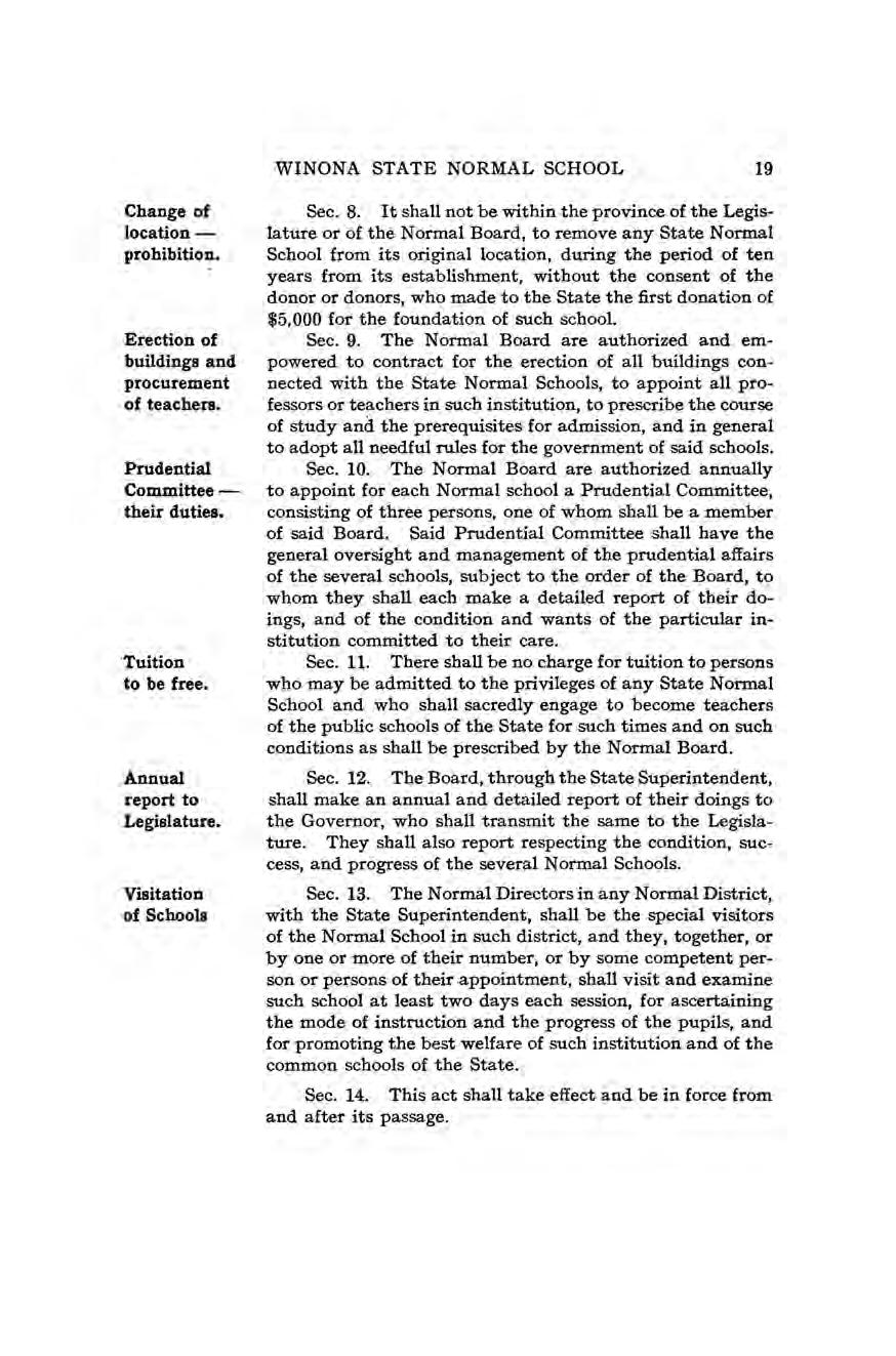 Feb. 29,1860 Act of Establishment of State Normal Schools suspended for five years; Winona Normal School excepted.
