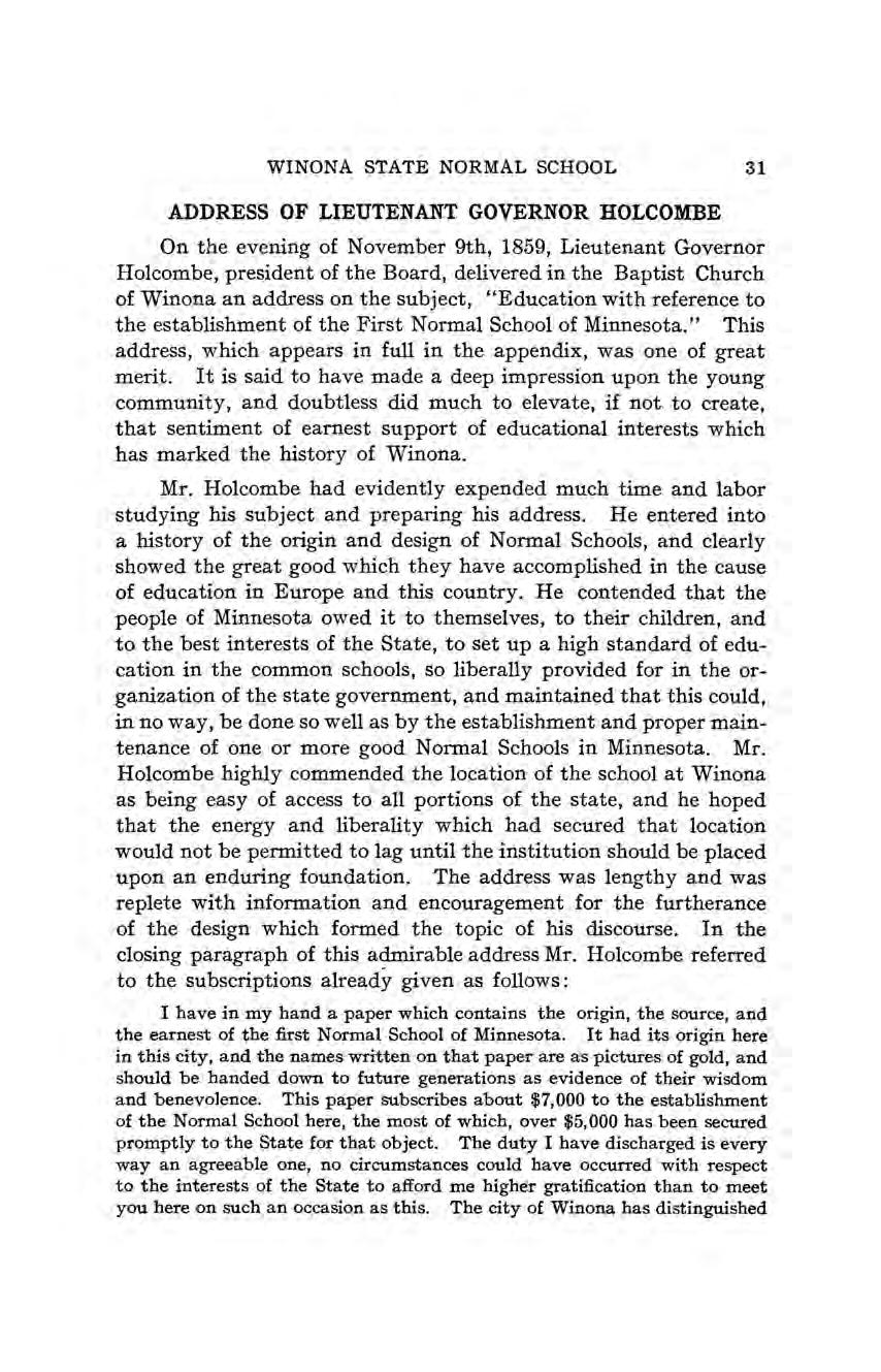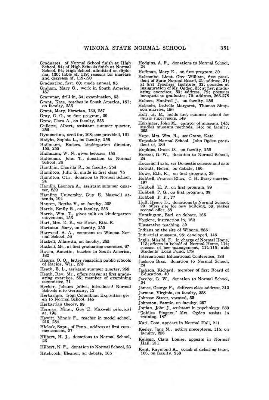 Williston, Frances G., on faculty, 257 Wilsey, Myrta, on faculty, 258 Wilson, Thomas, donations to Normal School, 23, 24; address at laying of corner stone, 7981; secures additional tax for benefit of Normal schools, 114 Winchester, Miriam C., on faculty, 257 Windom, Wm., donation to Normal School, 24 Winona Argus, opposes university in Winona, 2.