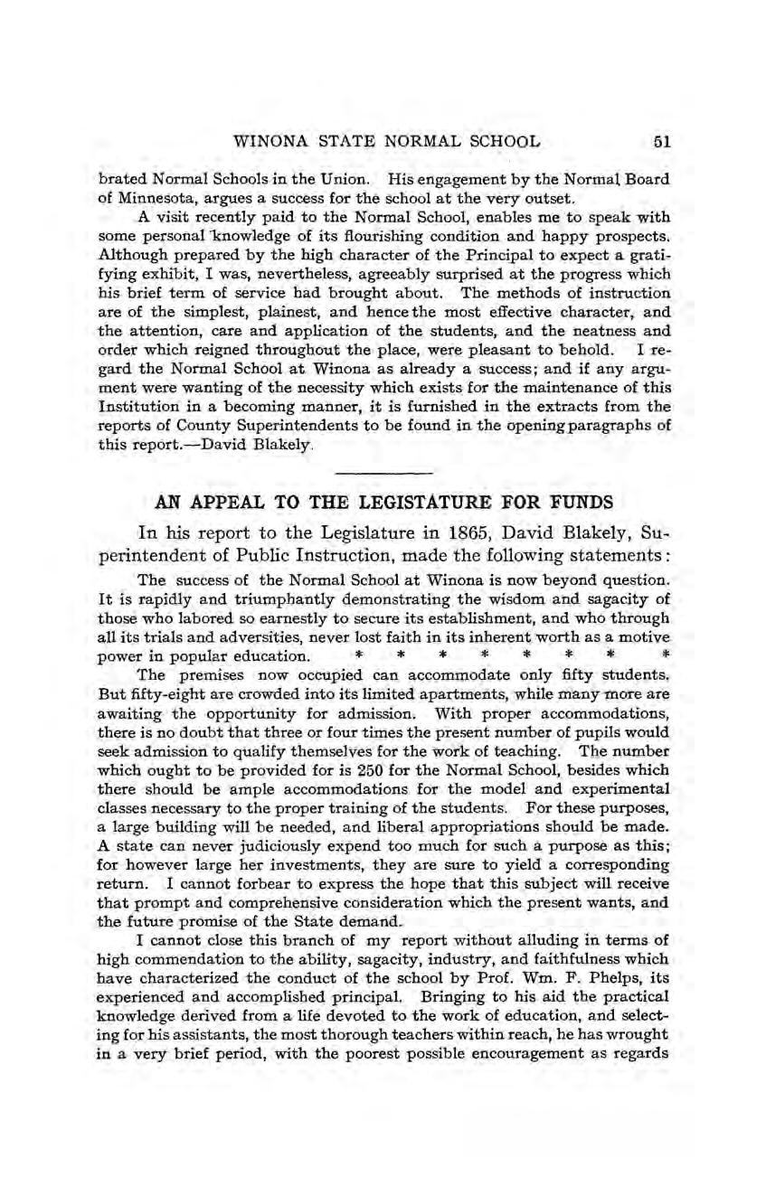 Three historical sketches of the institution have proved valuable in this endeavor: one in the History of Winona County; one by Dr. Shepard based on the sketch just referred to; and one, from 1864 to 1876 inclusive, by ex-Principal W. F. Phelps. This sketch was printed in the Bulletin for December, 1905.
