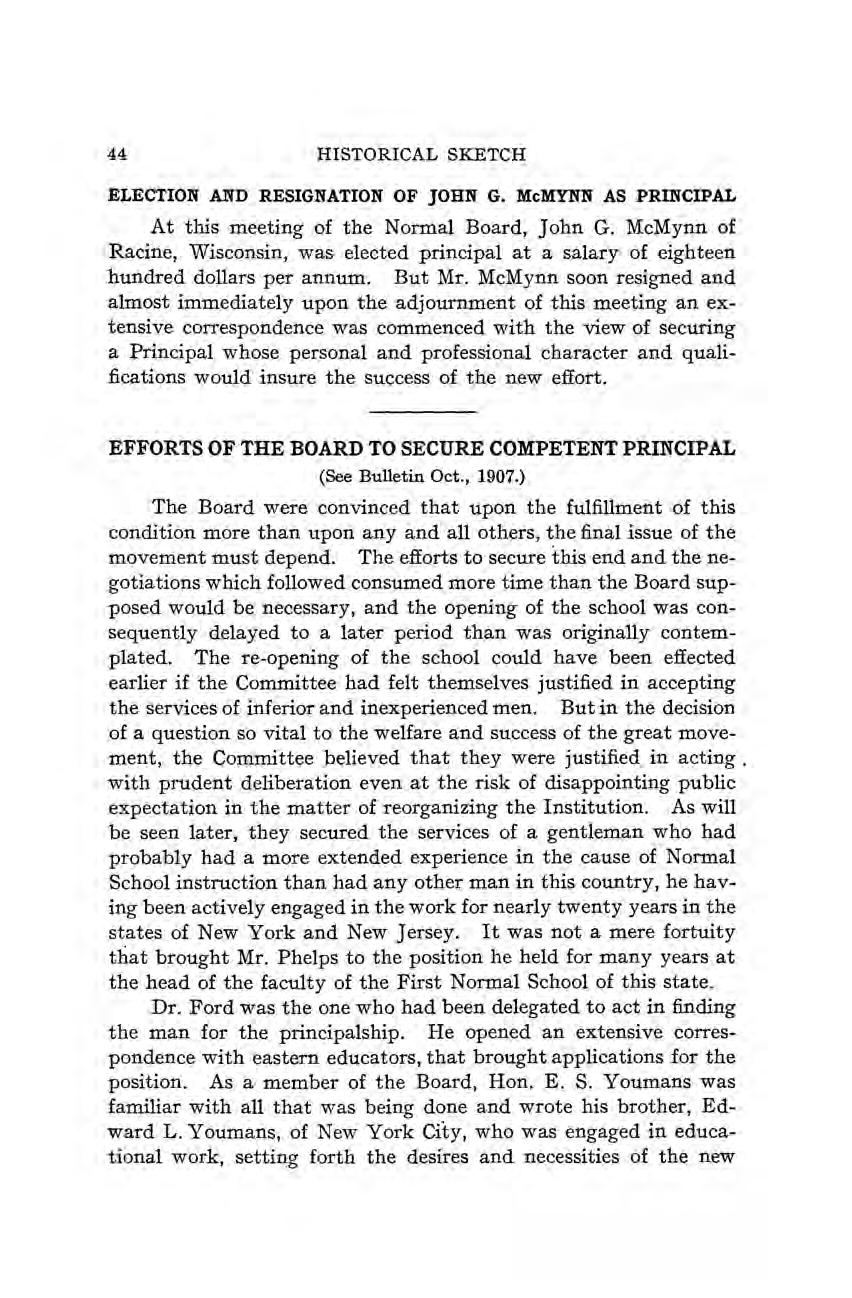 For several reasons the present historical sketch puts most stress on the early history of the school. In the first place, no history was published at the end of the first twenty-five years, as is customary with most normal schools, and the sources for this period are very limited indeed. The destruction of a single volume for these years would be an irreparable loss, so far as the history of the institution is concerned. Furthermore, many persons have already passed away whoseservices would have been invaluable in this undertaking, and an effort has been made to record much which is contained in but a few rare volumes or locked up in the memory of those yet living.