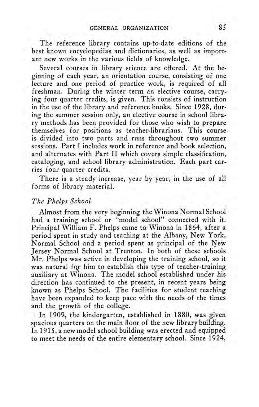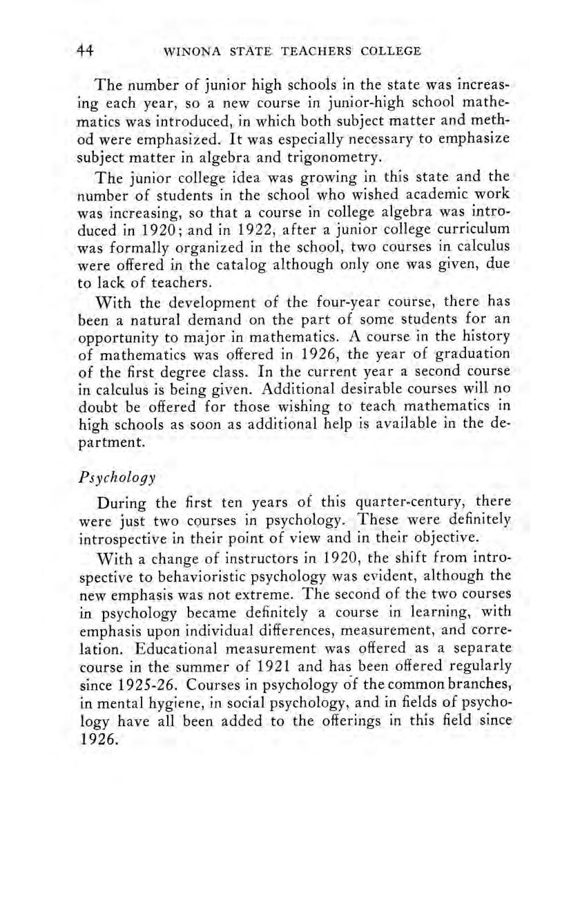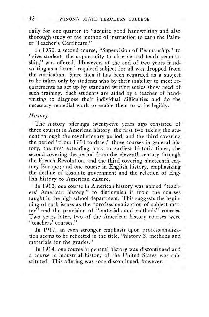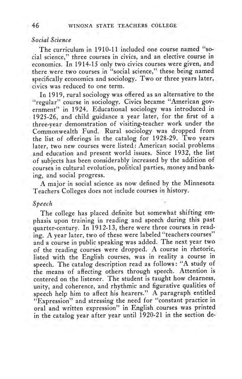 In the Historical Sketch and Notes of the Winona State Normal School, published in 1910, at the close of the first fifty years of the school’s existence, the record of changes in the curriculum was introduced with this general statement: ‘The purpose of this sketch is to record the facts connected with the changes in the curriculum of the Winona State Normal School during the first fifty years of its history, without attempting to discuss, except incidentally, the causes, the importance, or the influences of these changes.