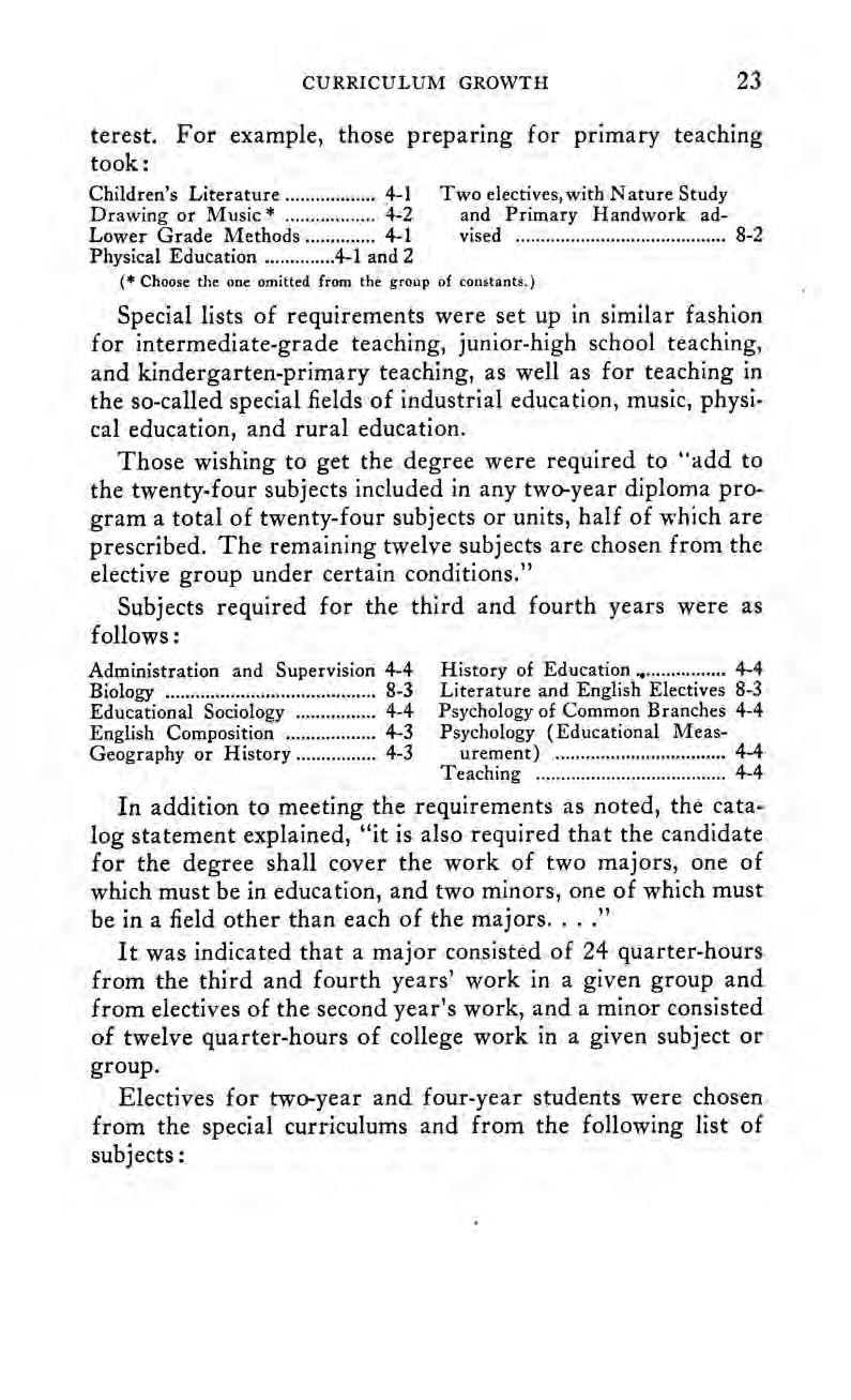 Broader opportunities for study were provided by a rather liberal offering of electives. “As the facilities of the school permit,” runs the catalog announcement, ‘‘one or more of the following electives will be offered and may be chosen by the student, after consultation with the president, in lieu of certain subjects in the course of study: agriculture, two terms; advanced physics, one term; astronomy, one; children’s literature, one; drawing supervision, two; economics, one; English, two; home economics, three; Latin, two; library science, one; manual training, two; modern European history, two; music supervision, two; physical culture, one; primary methods, one; public speaking, one; special methods, one; writing and spelling, one-half.”