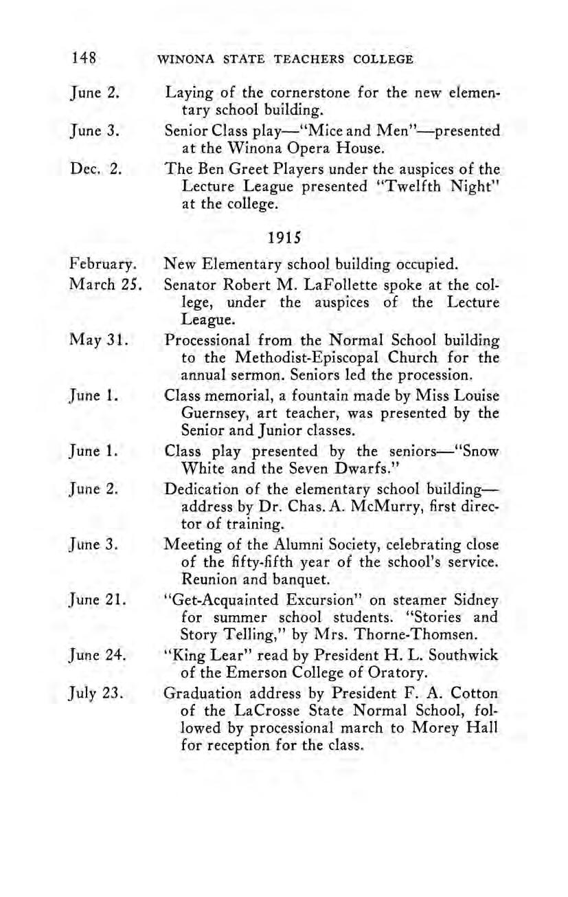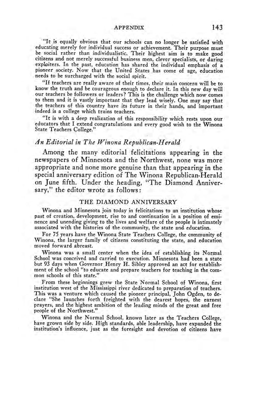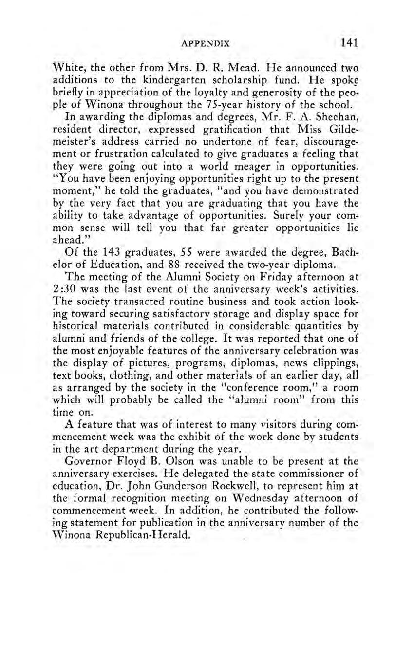 The Seventy-Fifth Anniversary Celebration A Message from Governor Floyd B. Olson. An Editorialin The Winona Republican-Herald. A Partial Chronology of Important Events, 1910-1935.