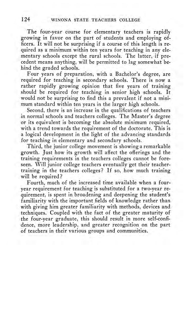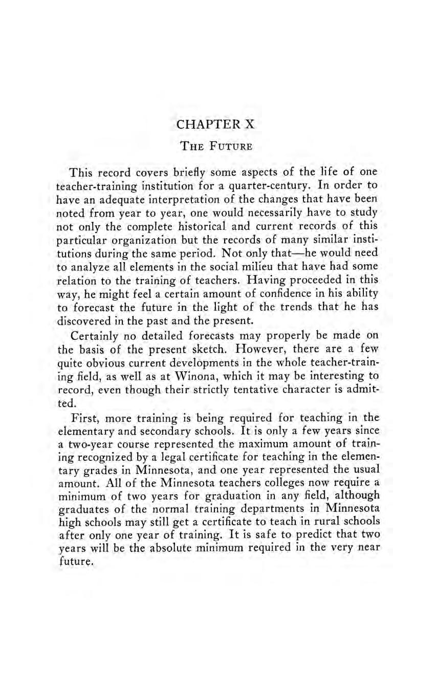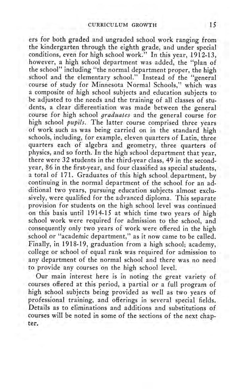 “With the close of the period (1895-1910),” said the writer, “‘we see signs of the early introduction of courses designed to prepare teachers who desire to specialize more fully than has been heretofore or is now possible. Moreover, the Minnesota normal schools seem about to give serious and sympathetic consideration to plans for enlarging the scope of their professional training for teachers so that these schools shall become normal colleges or preferably teachers colleges, a