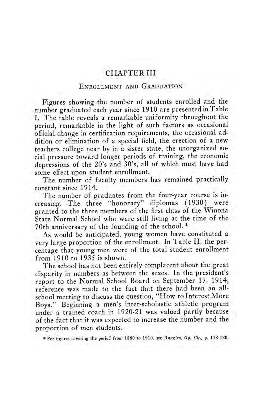 The only systematic history of the Winona State Teachers College was published in 1910, fifty years after the founding of the school (then and until 1921 known as the Winona State Normal School). It was produced under the editorship—and to some extent the authorship—of Dr. Clyde O. Ruggles, then a member of the faculty. Ruggles expressed regret that no systematic record had been assembled at the close of the first quarter-century of the school’s existence. In view of the fact that this had not been done and that the records for the early period were even then very scant, and some of them available only in the memories of a small number of persons, the editor of the 1910 historical sketch devoted much time and space to the very early period in the life of the school.