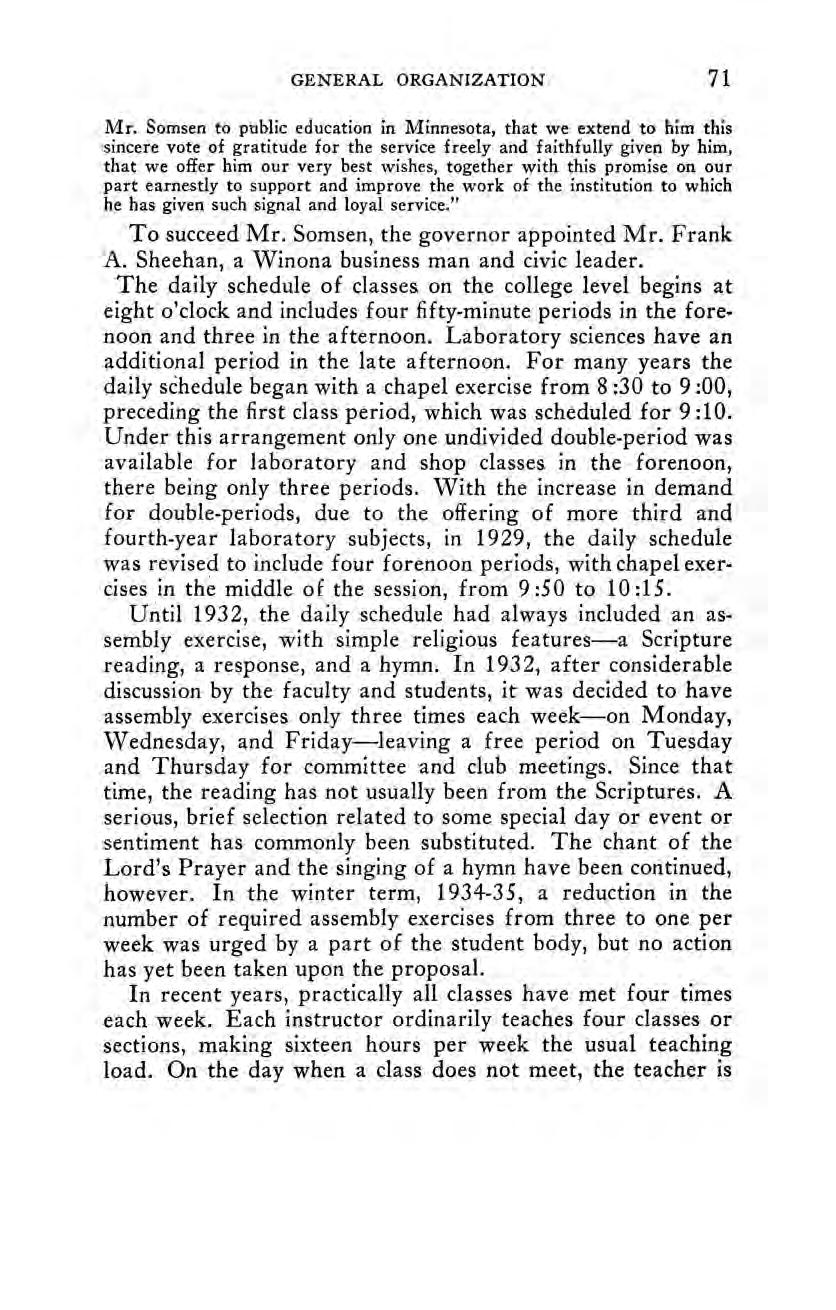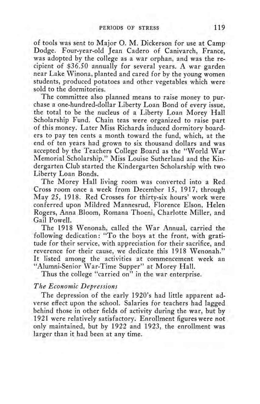In the face of convincing evidence that the people ofMinnesota were from the very first interested in a system of schools under trained teachers, it is not surprising to discover that the State Legislature has supported the school at Winona consistently throughout the 75 years of its existence. Only once—in 1876—has the school faced a serious financial threat to its existence. With the exception of that one year, when the Legislature failed to make any appropriation for its maintenance, legislative support has been adequate for the carrying out of the program of the early years and for moderate extensions as changing conditions have shown them to be necessary.