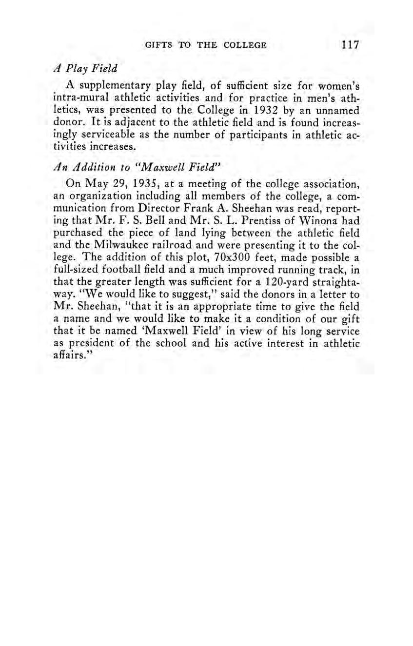 May 29. Messrs. F. S. Bell and S. L. Prentiss completed by gift the north portion of the athletic field, proposing for the future the name, ‘Maxwell Field.”