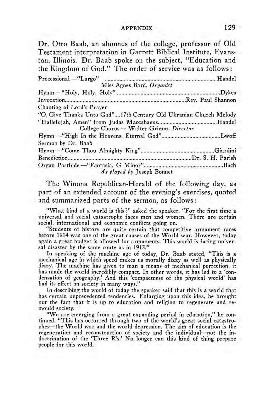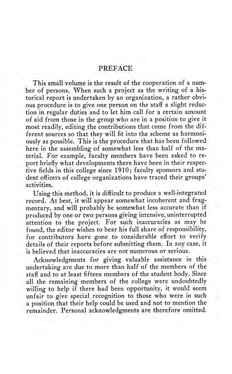 This small volume is the result of the cooperation of a number of persons. When such a project as the writing of a historical report is undertaken by an organization, a rather obvious procedureis to give one person on the staff a slight reduction in regular duties and to let him call for a certain amount of aid from those in the group who are in a position to give it most readily, editing the contributions that come from the different sources so that they will fit into the scheme as harmoniously as possible. This is the procedure that has been followed here in the assembling of somewhat less than half of the material. For example, faculty members have been asked to report briefly what developments there have been in their respective fields in this college since 1910; faculty sponsors and student officers of college organizations have traced their groups’ activities.