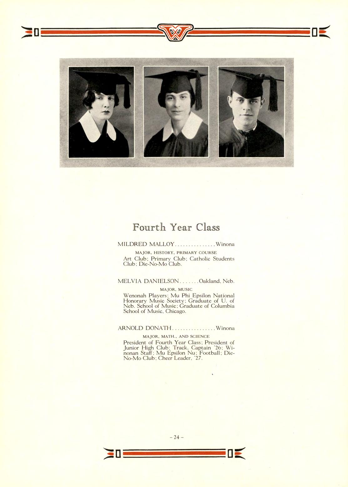 President of Eourth Year Class; President of Junior High Club; Track, Captain ’26; Winonan Staff ; Mu Epsilon Nu ; Eootball ; DieNo-Mo Club; Cheer Leader, '27.