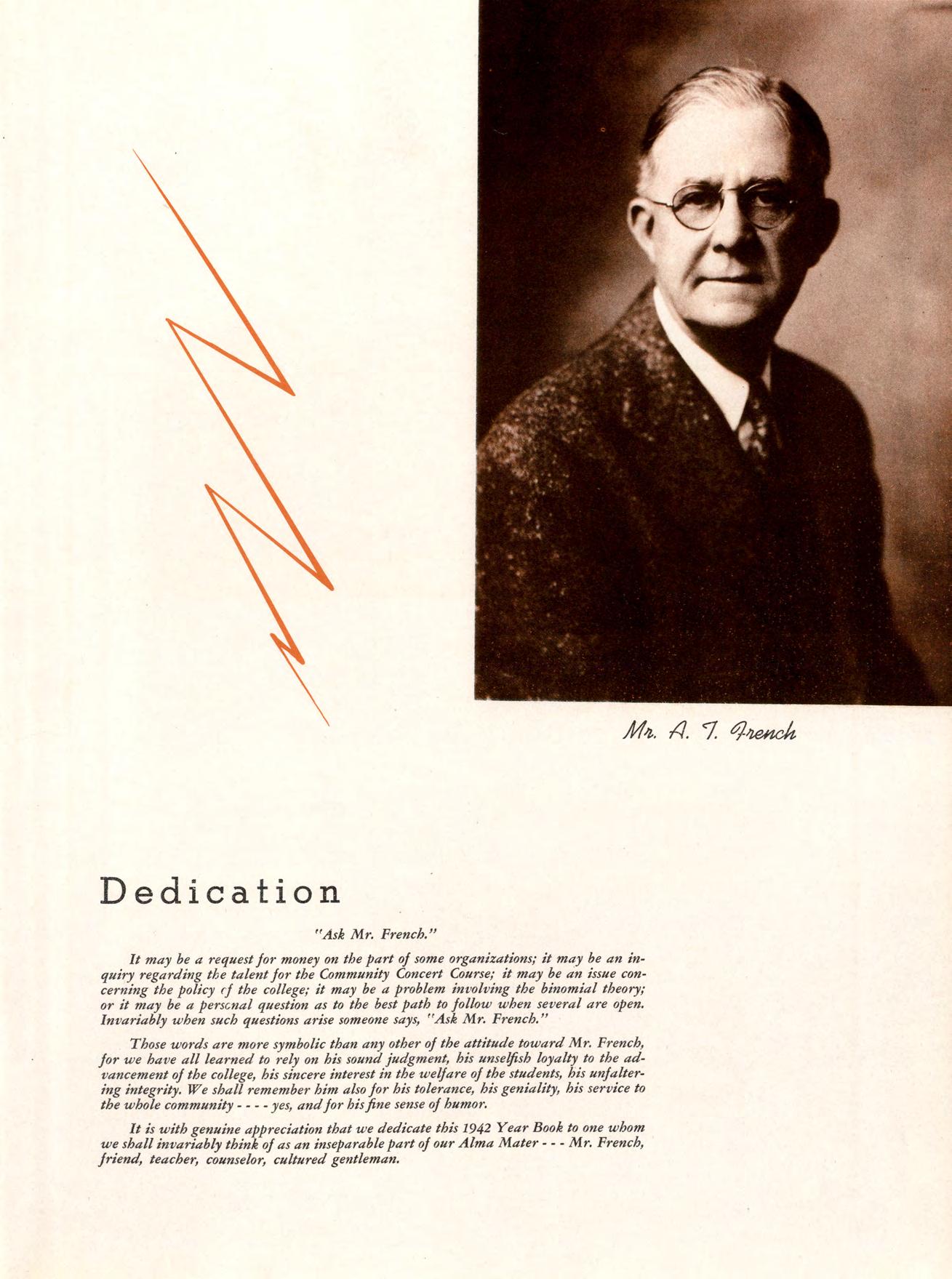 It is with genuine appreciation that we dedicate this 1942 Year Book to one whom we shall invariably think of as an inseparablepart of our Alma Mater Mr. French, friend, teacher, counselor, cultured gentleman.