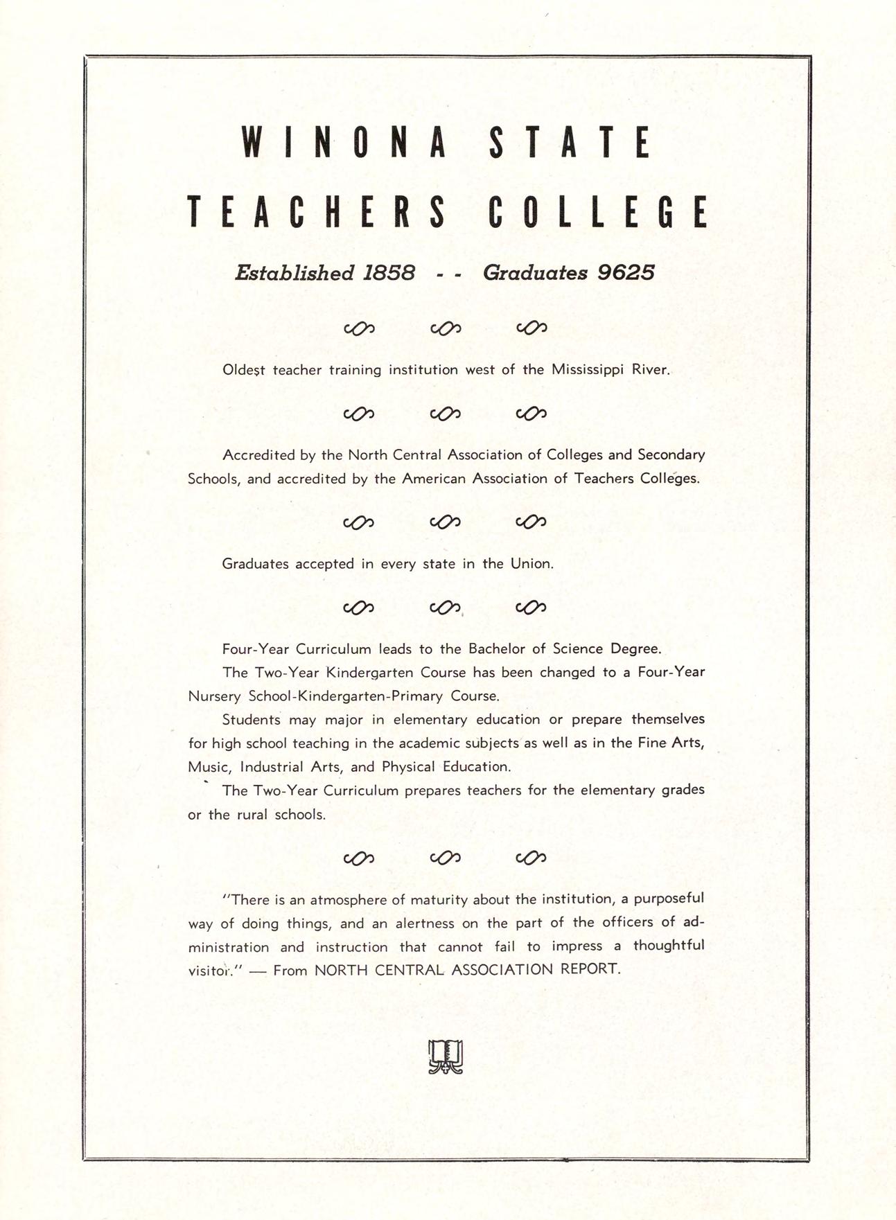 The Two-Year Kindergarten Course has been changed to a Four-Year Nursery School-Kindergarten-Primary Course. Students may major in elementary education or prepare themselves for high school teaching in the academic subjects as well as in the Fine Arts, Music, Industrial Arts, and Physical Education.