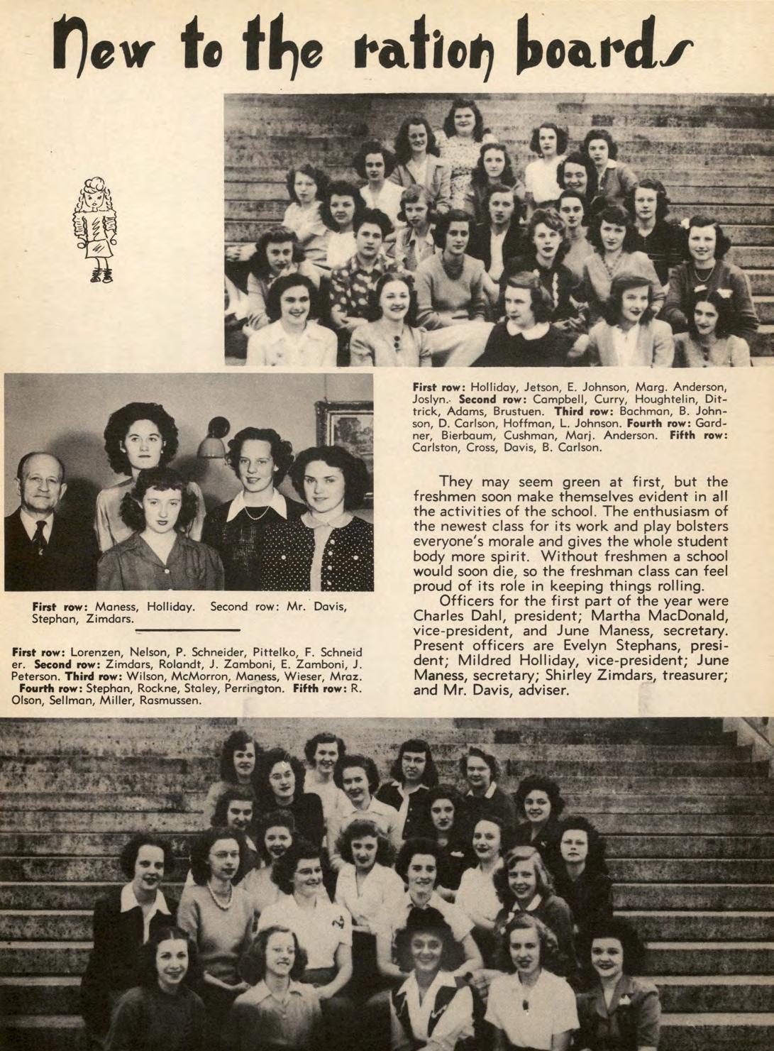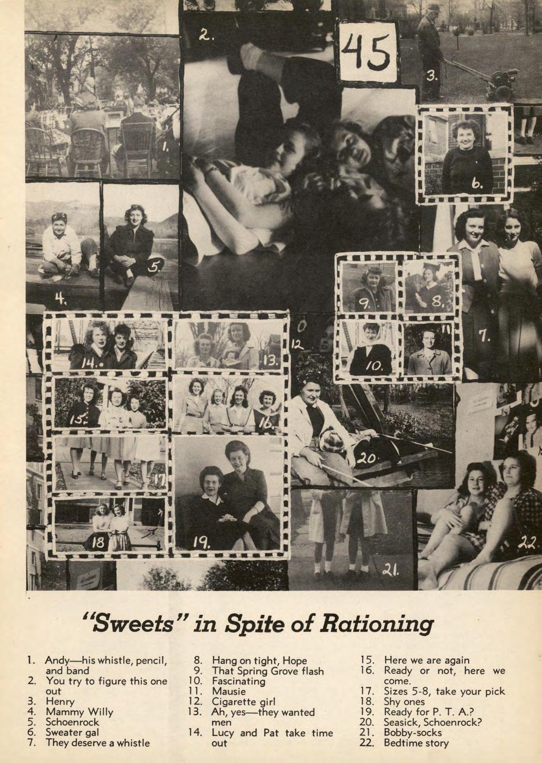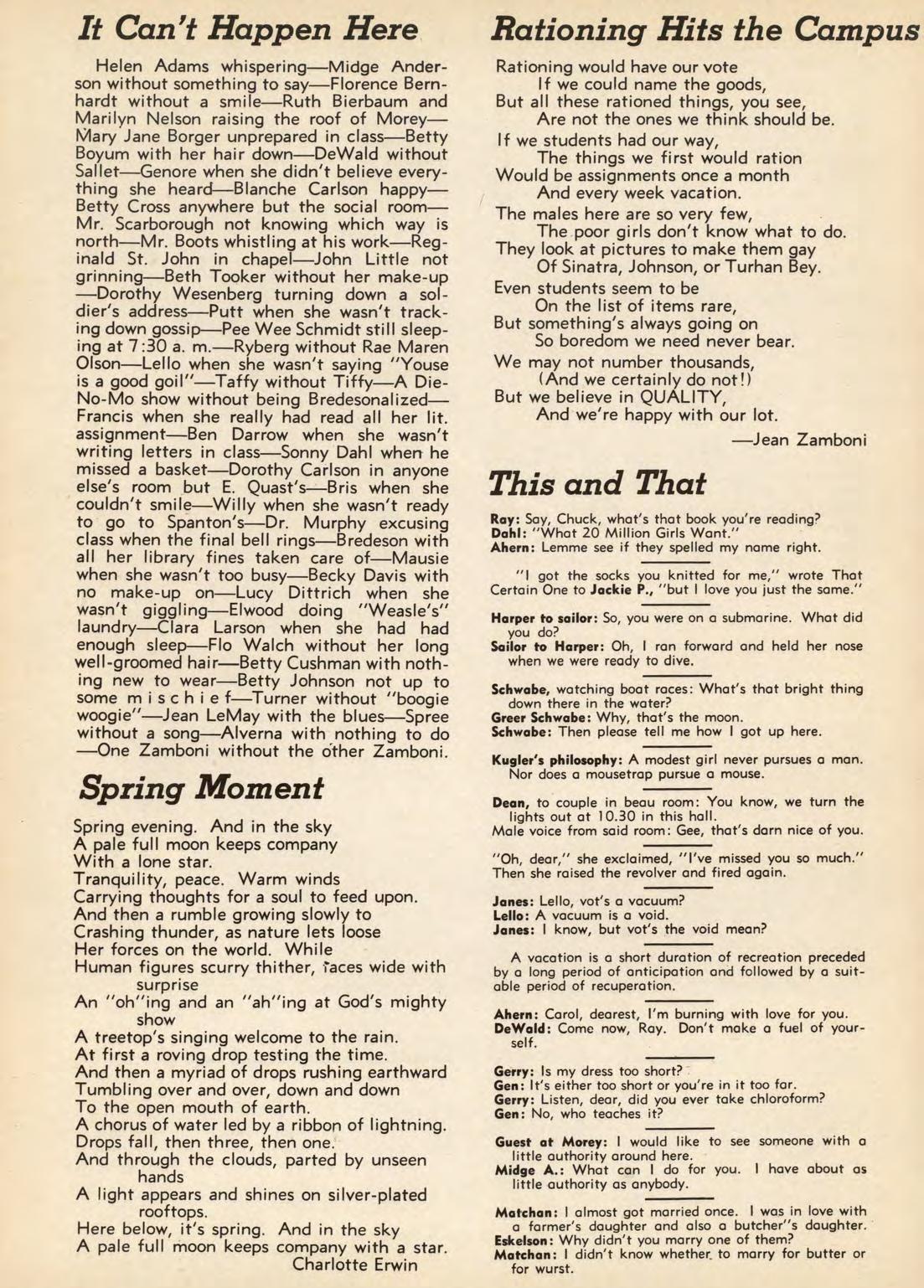 Possibly we might forget the sine of a 30 degree angle, the Committee of Ten, or the poems of David Greenhood, but far be it from us to ever forget our first week of pushing pencils over Thurston tests upon entrance—the meatballs written up in popular song (only we did get bread with Morey Hall meat balls)—our nickels that found their way in McVey's jute box when "South" was in vogue—that horrible substitute for an old-fashioned glass of water (early morning rising bells)—the many reasons why the $85 yard light in front of the dorms should be removed (save electricity and yard space, to mention a few)—the importation of the Naval Unit from the bluff—the week-end spreads between blinking of lights— that 10.29 line-up at Macs—a quiet chapel hour at Spanton's—the artistry on the doors of the botany lab—the social committee what had so much to do—that Syracuse polish that no one took a shine to—that "elite" town clique that wouldn't be bothered—Mr. Davis' immortal quotation, "I'm the fellow they call Eddie down at the high school"—those penny fines that started many a merry chase—versatile Dean Lud who united a house divided— the Schwabe-Greer romance that kept everyone guessing—the servicemen who came back to visit—and Gladys Anderson who made them welcome—the Varga pictures that were conspiciously absent during open house at homecoming—the monthly stamp rallies always surprising us—our character-building basketball games—those salvage bins that lend atmosphere to the Grecian urn—the whisperings whenever a new shipment of bars and - -s hit Mac's and Spanton's—that Morey-Shepard Basketball fued between old friends—Ma's popularization of little boy caps—the landslide of presidential candidate Dewey (with Casby counting votes)—Mutton, mutton, who's got the mutton (no one—its's in the hash)—Matchan's promoting the good neighbor policy between Lucas and the Shepard preceptress—Moonbeam (need it be said?) the independence of the school clocks when it came to keeping time—the day the faculty modeled dunce caps on stage—Bredeson's fabulupchuous vocabulary—the unbiased and often fair decisions of thedorm council— Queen Vi crowned by Vern—orchids to Croonie via Ashley—Midge's immortal Worms and stale jokes—the cider and doughnuts at the hard times party—lesson plans at the eleventh hour—saying "happy birthday, Carrol" with flowers - lots of them—the "Back Home for Keeps" pictures—the ruins of West Lodge and the old playing cards found therein—the slack boat racing season—Henry's illness after election day—the look of consternation on the face of the mailman as some 50 oddly assorted girls rush at him every morn—the new dean's gavel—Sylvia Lello as the redheaded Russian, Stephan Stephanovitch—^Taffy Grimm's psychological deductions—all the chess games Mr. Jackson won—contemporary