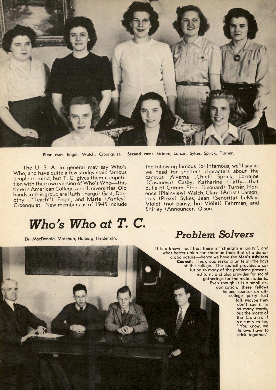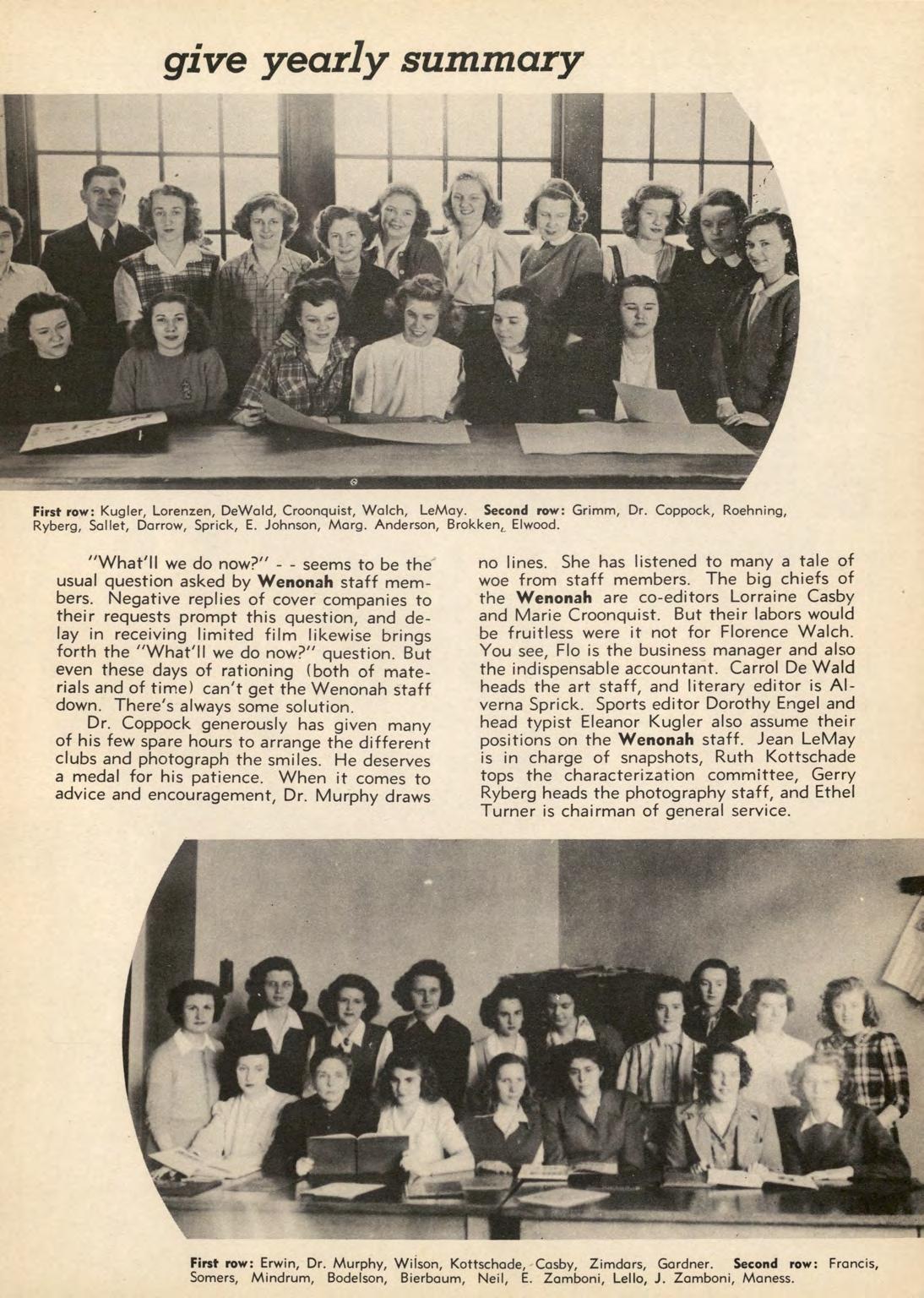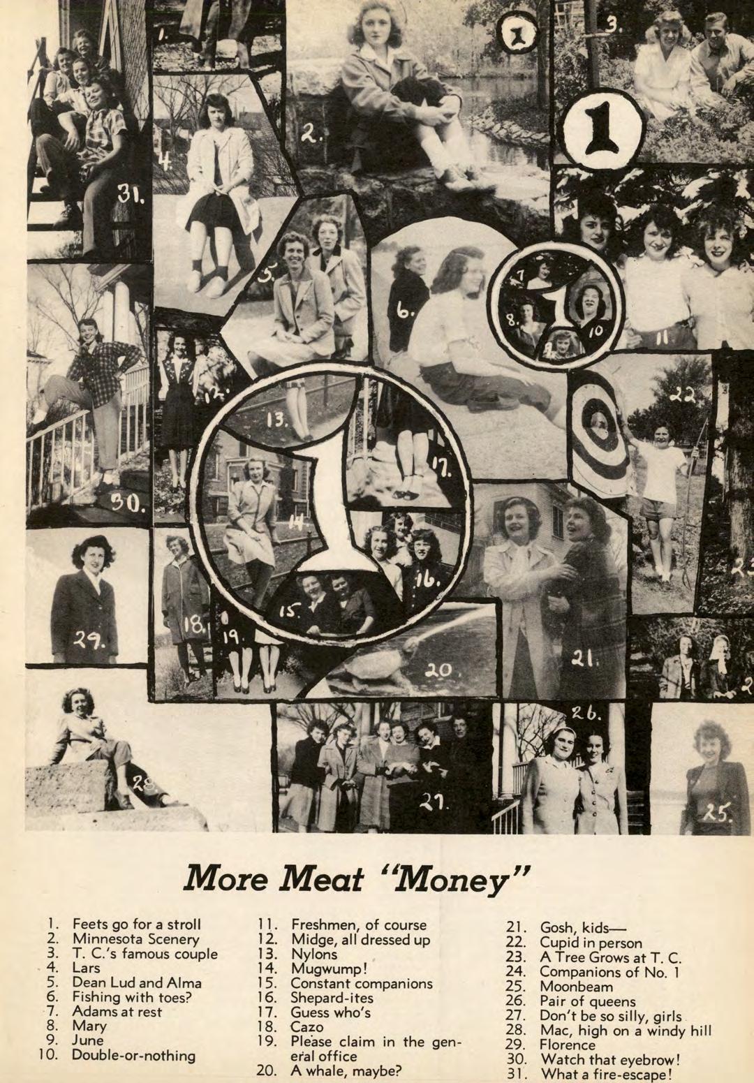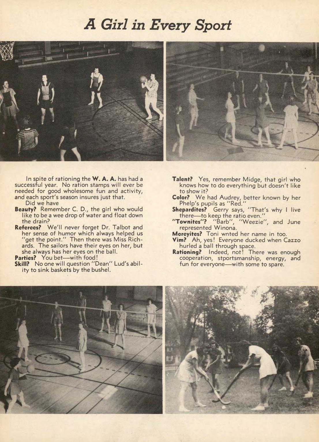 Possibly we might forget the sine of a 30 degree angle, the Committee of Ten, or the poems of David Greenhood, but far be it from us to ever forget our first week of pushing pencils over Thurston tests upon entrance—the meatballs written up in popular song (only we did get bread with Morey Hall meat balls)—our nickels that found their way in McVey's jute box when "South" was in vogue—that horrible substitute for an old-fashioned glass of water (early morning rising bells)—the many reasons why the $85 yard light in front of the dorms should be removed (save electricity and yard space, to mention a few)—the importation of the Naval Unit from the bluff—the week-end spreads between blinking of lights— that 10.29 line-up at Macs—a quiet chapel hour at Spanton's—the artistry on the doors of the botany lab—the social committee what had so much to do—that Syracuse polish that no one took a shine to—that "elite" town clique that wouldn't be bothered—Mr. Davis' immortal quotation, "I'm the fellow they call Eddie down at the high school"—those penny fines that started many a merry chase—versatile Dean Lud who united a house divided— the Schwabe-Greer romance that kept everyone guessing—the servicemen who came back to visit—and Gladys Anderson who made them welcome—the Varga pictures that were conspiciously absent during open house at homecoming—the monthly stamp rallies always surprising us—our character-building basketball games—those salvage bins that lend atmosphere to the Grecian urn—the whisperings whenever a new shipment of bars and - -s hit Mac's and Spanton's—that Morey-Shepard Basketball fued between old friends—Ma's popularization of little boy caps—the landslide of presidential candidate Dewey (with Casby counting votes)—Mutton, mutton, who's got the mutton (no one—its's in the hash)—Matchan's promoting the good neighbor policy between Lucas and the Shepard preceptress—Moonbeam (need it be said?) the independence of the school clocks when it came to keeping time—the day the faculty modeled dunce caps on stage—Bredeson's fabulupchuous vocabulary—the unbiased and often fair decisions of thedorm council— Queen Vi crowned by Vern—orchids to Croonie via Ashley—Midge's immortal Worms and stale jokes—the cider and doughnuts at the hard times party—lesson plans at the eleventh hour—saying "happy birthday, Carrol" with flowers - lots of them—the "Back Home for Keeps" pictures—the ruins of West Lodge and the old playing cards found therein—the slack boat racing season—Henry's illness after election day—the look of consternation on the face of the mailman as some 50 oddly assorted girls rush at him every morn—the new dean's gavel—Sylvia Lello as the redheaded Russian, Stephan Stephanovitch—^Taffy Grimm's psychological deductions—all the chess games Mr. Jackson won—contemporary