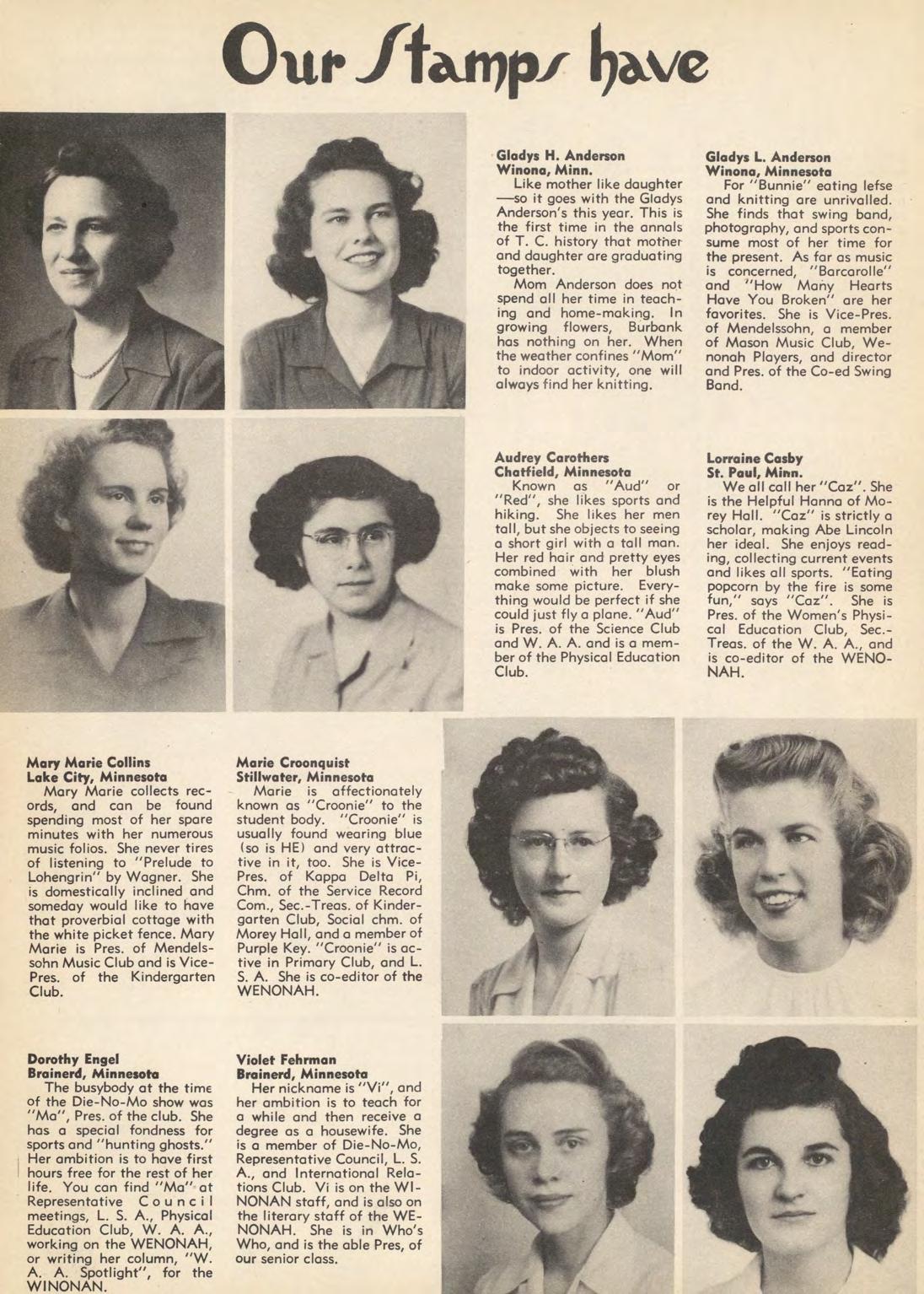 We do not know them all personally, and they do not know us, but one thing we have in common—we have all attended Winona State Teachers College. Some of them were teachers when Uncle Sam called them, and others left school to answer the call to arms. In memory of those who have given their lives, and to express our gratitude to those gallant men and women who are serving on the battle fronts of the world, in order that we may continue to prepare for a better future, we dedicate this yearbook to our alumni and students in the service.