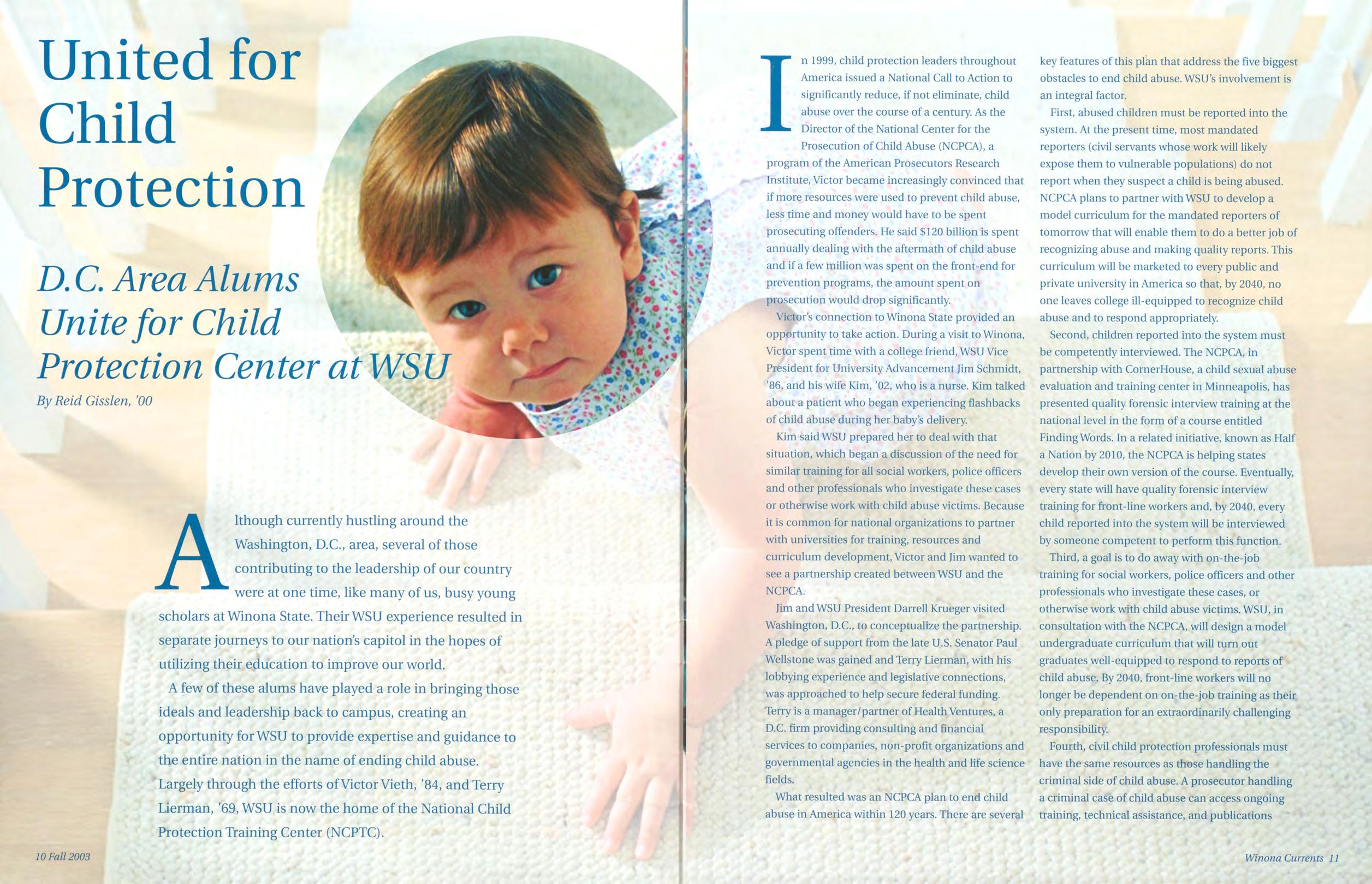 Largely through theefforts of Victor Vieth, ’84, and Terry Lierman, 69, WSU is now the home of the National Child Protection Training Center (NCPTC).