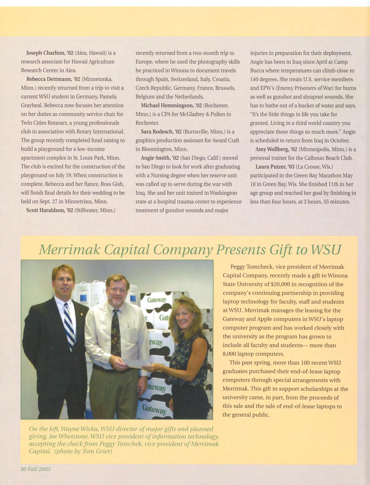 Fred Derocher, a 2003 WSU graduate from Cedarburg, Wis., recently shared his thoughts about scholarship assistance and what it means to students:
