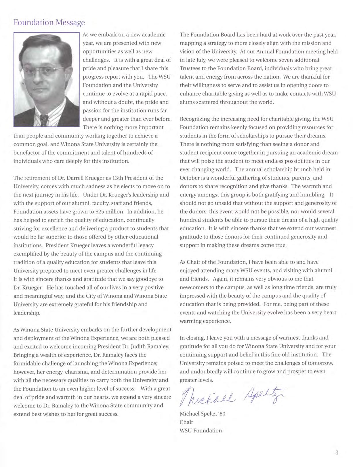 "We're providing health care workers, engineers, artists and many other professionals all of whom bring richness and depth not only to Winona but throughout the U.S. and beyond its borders.The awards of distinction alumni are proof that WSU's mission is being accomplished."