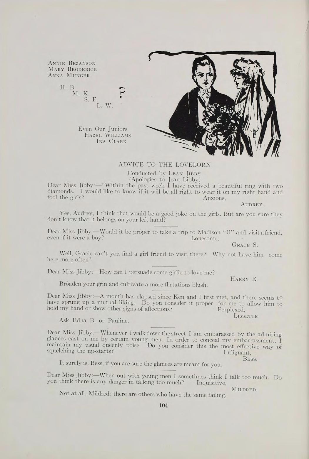 Dear Miss Jibby:—“Within the past week I have received a beautiful ring with two diamonds. I would like to know if it will be all right to wear it on my right hand and fool the girls? Anxious, Audrey.