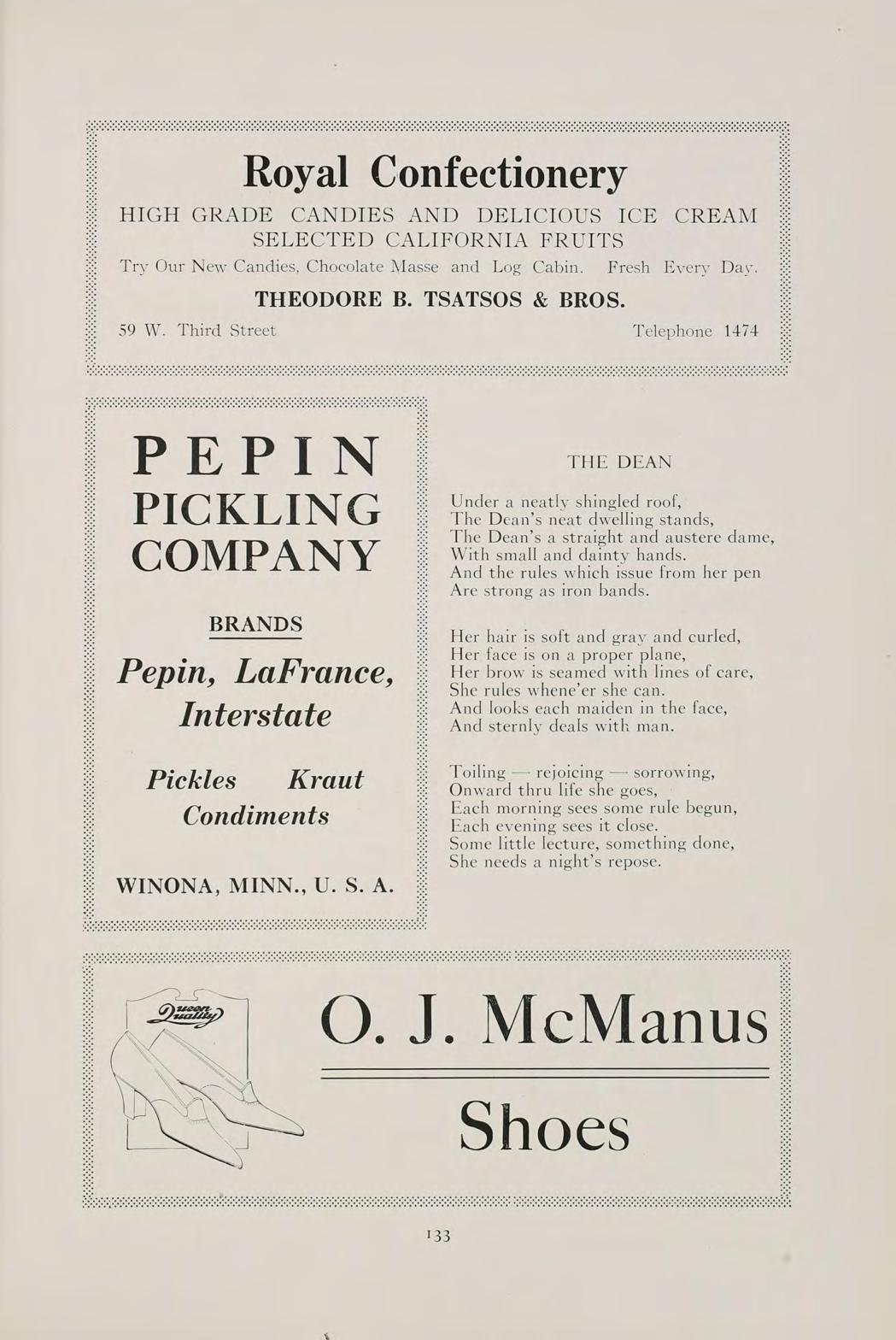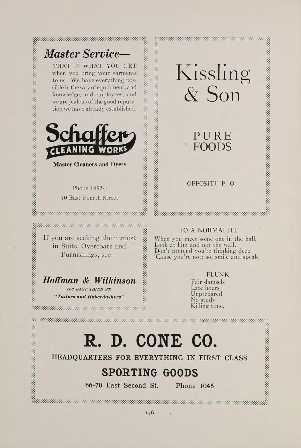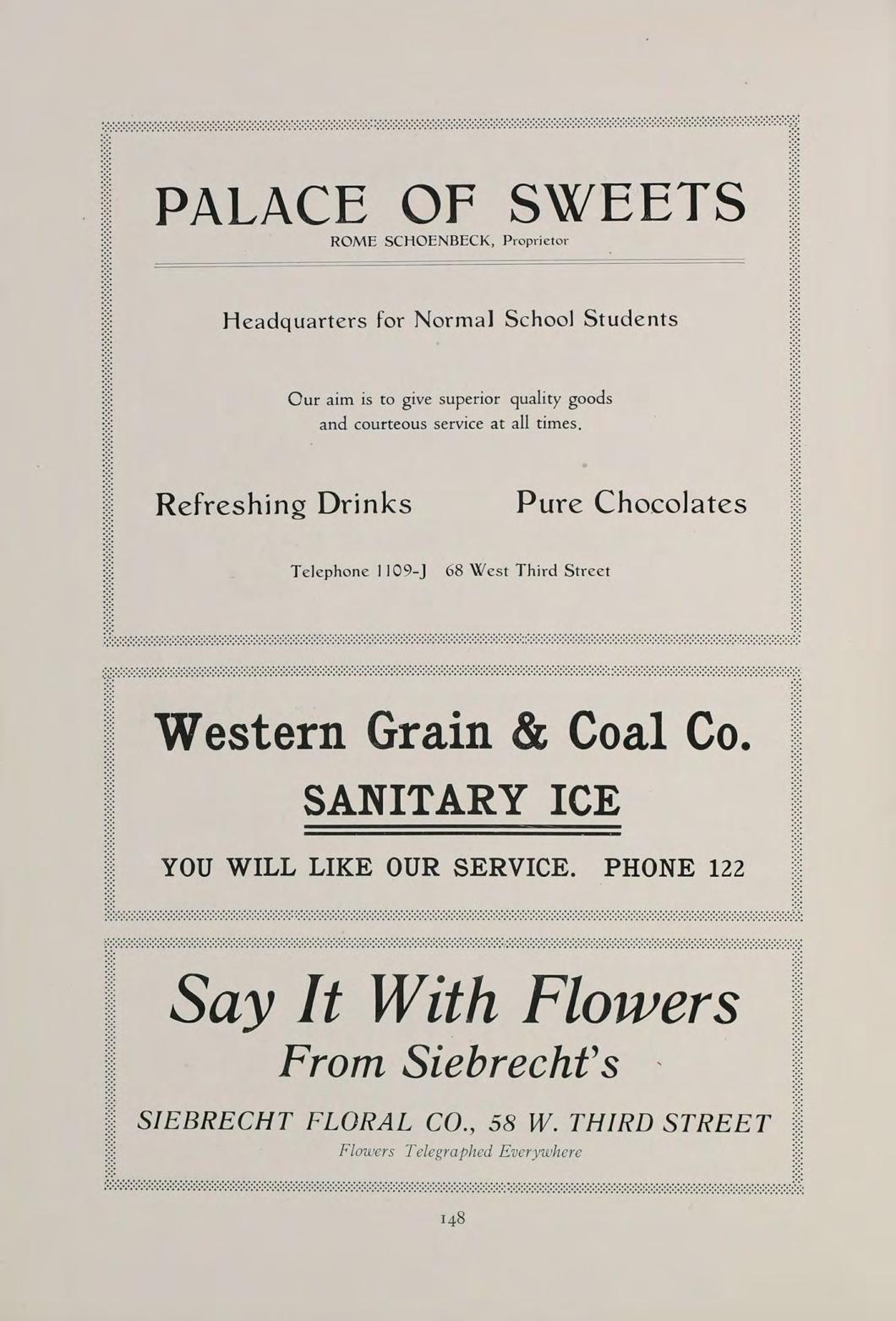 148 PALACE OF SWEETS ROME SCHOENBECK, Proprietor Headquarters for Normal School Students Our aim is to give superior quality goods and courteous service at all times. Refreshing Drinks Pure Chocolates Telephone 1109-J 68 West Third Street Western Grain & Coal Co. SANITARY ICE YOU WILL LIKE OUR SERVICE. PHONE 122 Say It With Flowers From Siebrechfs SIEBRECHT FLORAL CO., 58 W. THIRD STREET Flowers Telegraphed Everywhere