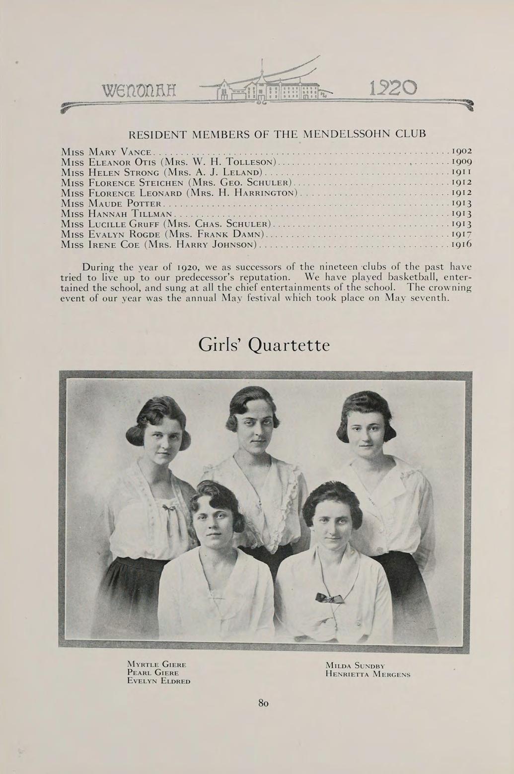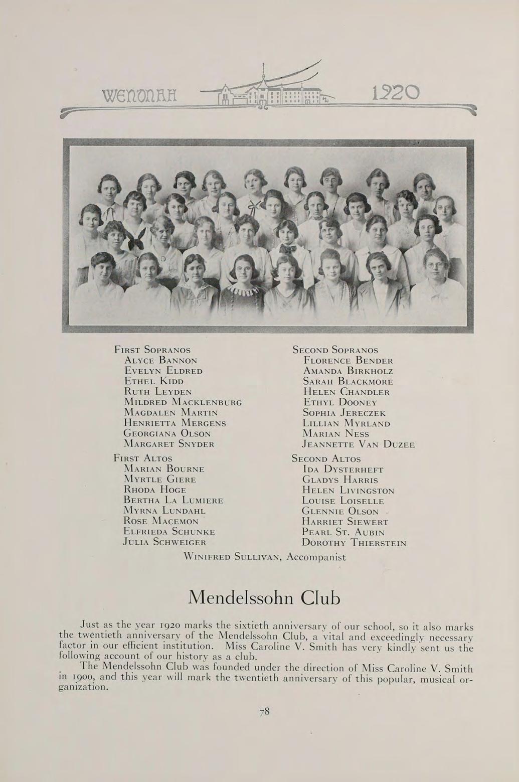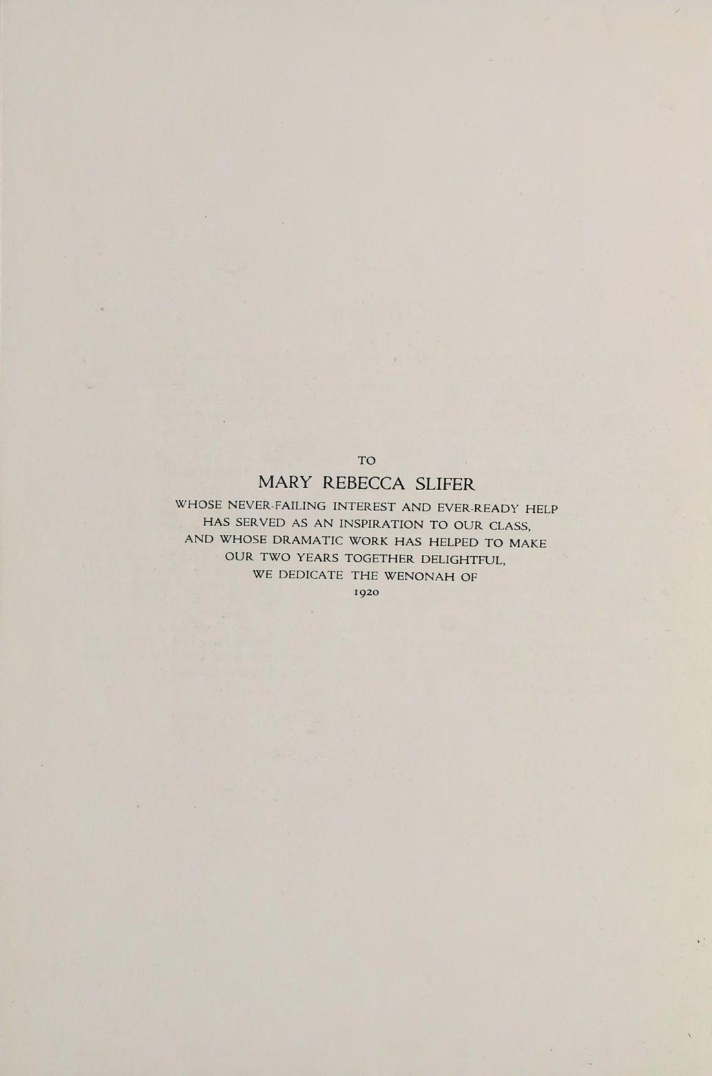 WHOSE NEVER-FAILING INTEREST AND EVER-READY HELP HAS SERVED AS AN INSPIRATION TO OUR CLASS, AND WHOSE DRAMATIC WORK HAS HELPED TO MAKE OUR TWO YEARS TOGETHER DELIGHTFUL, WE DEDICATE THE WENONAH OF 1920