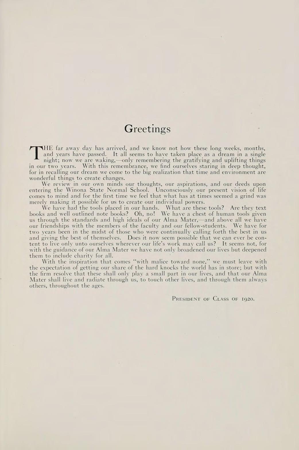 With the inspiration that comes “with malice toward none,” we must leave with the expectation of getting our share of the hard knocks the world has in store; but with the firm resolve that these shall only play a small part in our lives, and that our Alma Mater shall live and radiate through us, to touch other lives, and through them always others, throughout the ages.