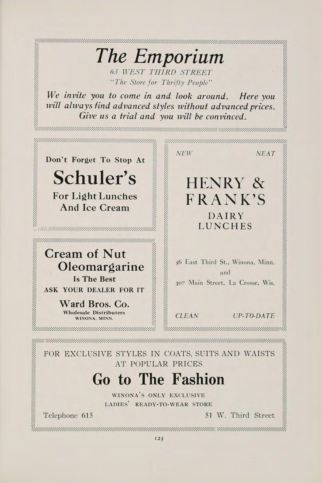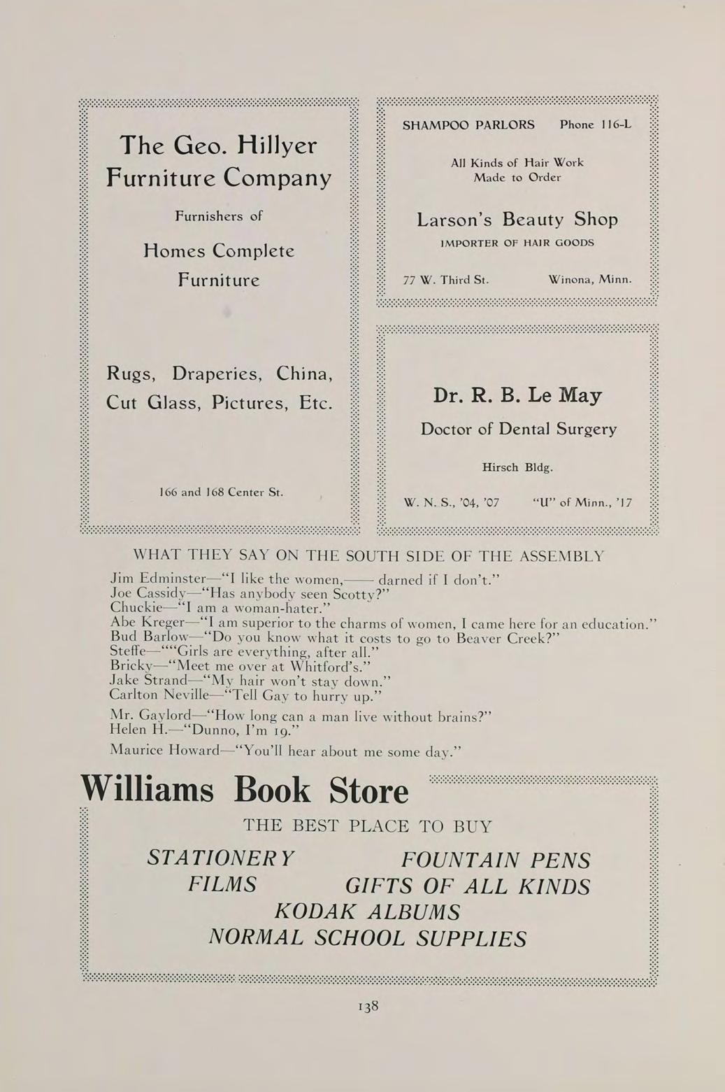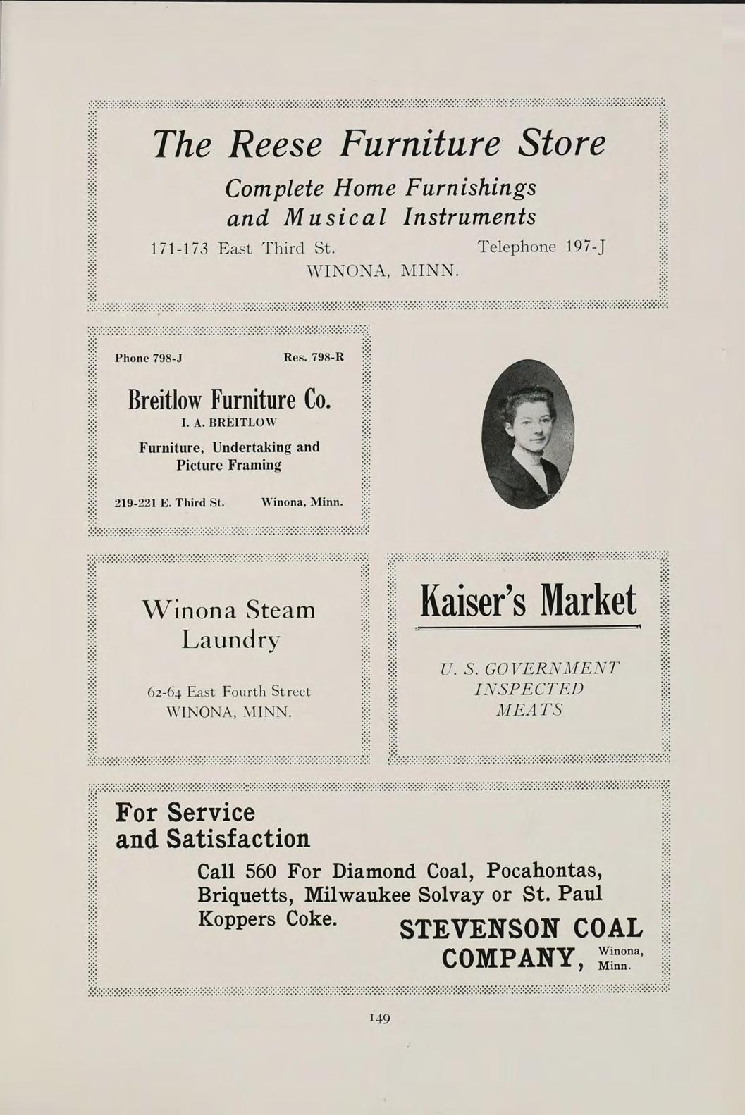 149 The Reese Furniture Store Complete Home Furnishings and Musical Instruments 171-173 East Third St. Telephone 197-J WINONA, MINN. Phone 798-J Res. 798 Breitlow Furniture Co. I. A. BREITLOW Furniture, Undertaking and Picture Framing 219-221 E. Third St. Winona, Mir Winona Steam Laundry 62-64 East Fourth Street WINONA, MINN. Kaiser’s Market U. S. GOVERNMENT INSPECTED MEA TS For Service and Satisfaction Call 560 For Diamond Coal, Pocahontas, Briquetts, Milwaukee Solvay or St. Paul Koppers Coke. STEVENSON COAL COMPANY, Winona, Minn.