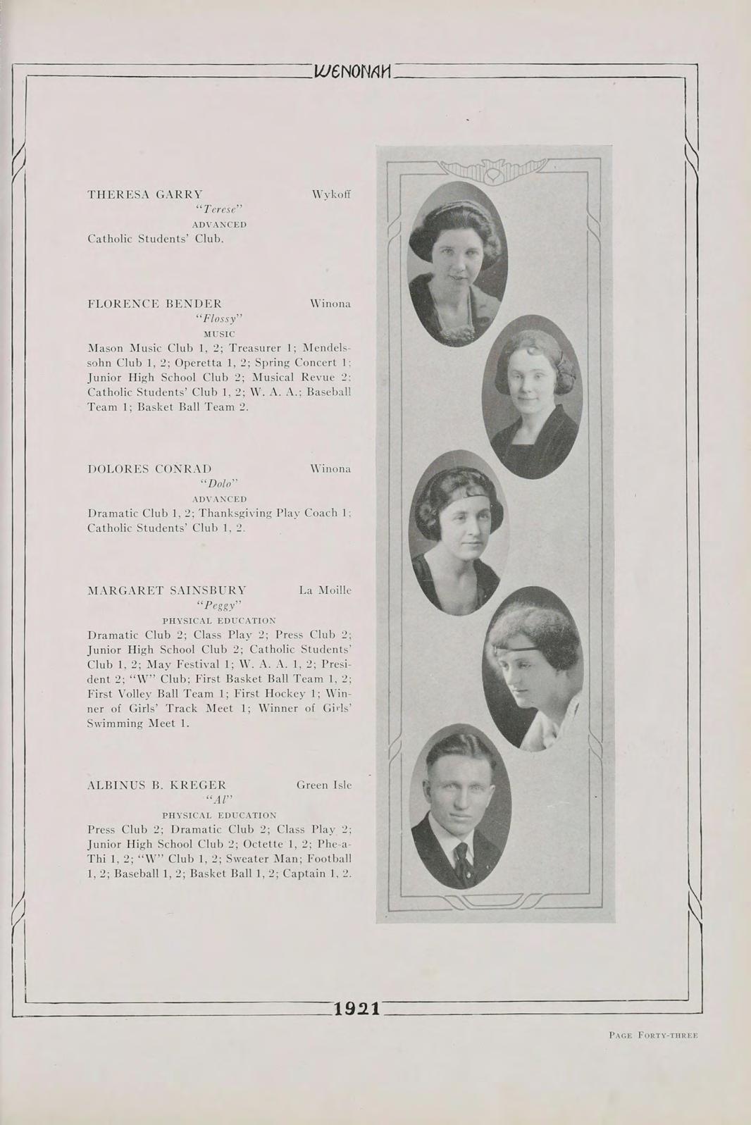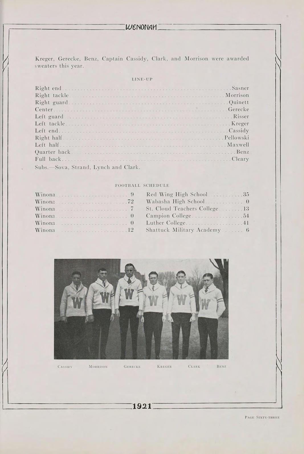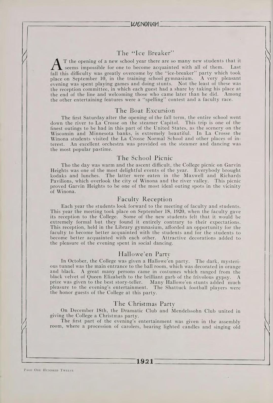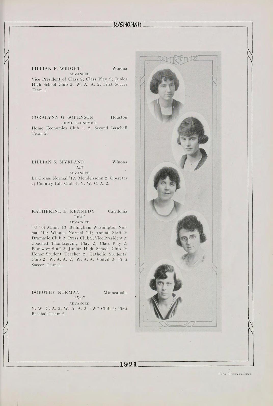 Surely, then, it is not futile to say that our class, the first class to be graduated since the institution has been rechristened Winona State Teachers College, the class of 1921, is going to do its share in the fostering of education. Above all, let us remember always, that America’s safety positively depends, in the last analysis, upon the education of its common people.