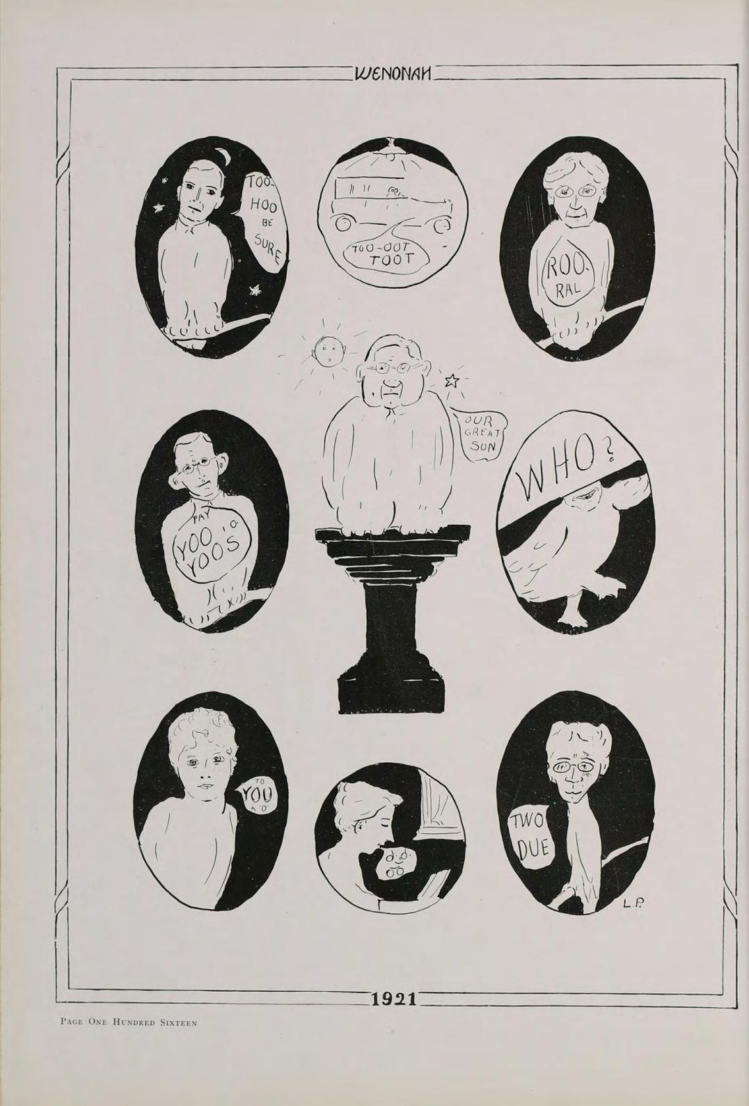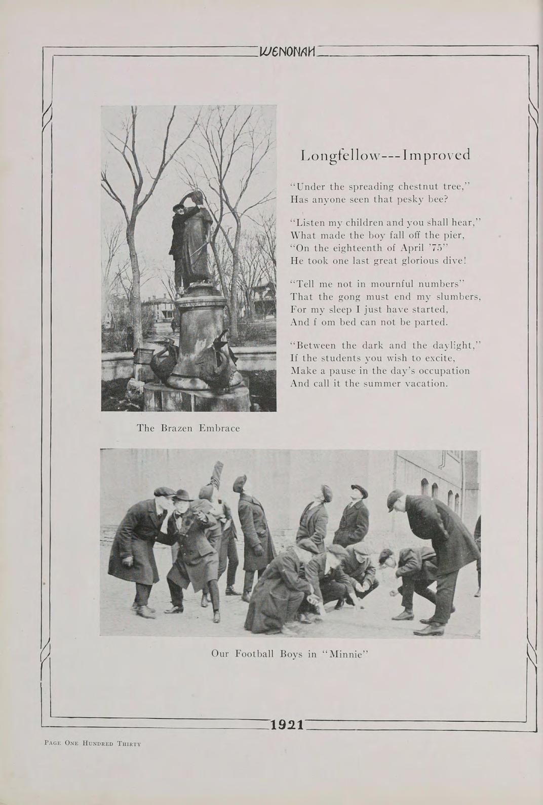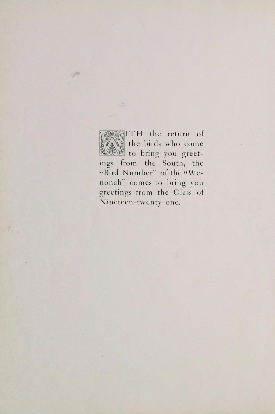 ITH the return of the birds who come to bring yon greetings from the South, the “Bird Number” of the “Wenonah” comes to bring you greetings from the Class of Nineteen-twenty-one.