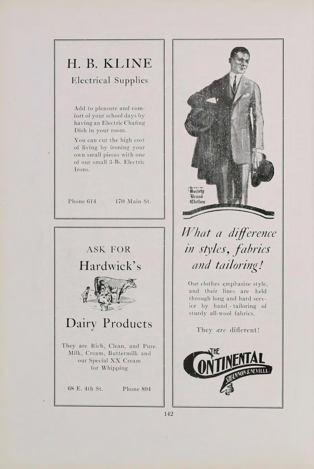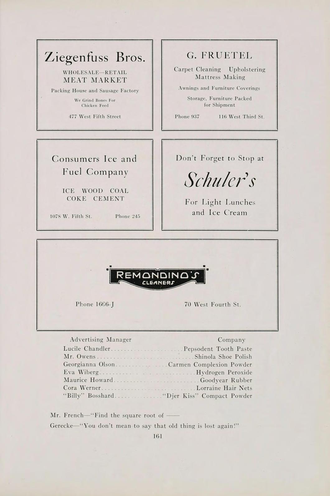 FRUETEL WHOLESALE—RETAIL MEAT MARKET Carpet Cleaning Upholstering Mattress Making Packing House and Sausage Factory Awnings and Furniture Coverings We Grind Bones For Chicken Feed Storage, Furniture Packed for Shipment 477 West Fifth Street Phone 937 116 West Third St. Consumers Ice and Don’t Forget to Stop at Fuel Company Schuler's ICE WOOD COAF COKE CEMENT For Light Lunches 1078 W. Fifth St.Phone 245 and Ice Cream