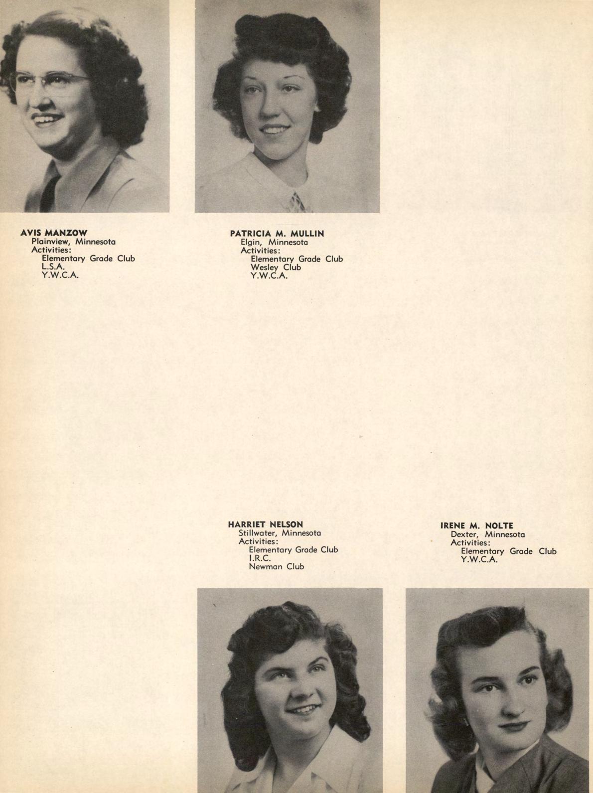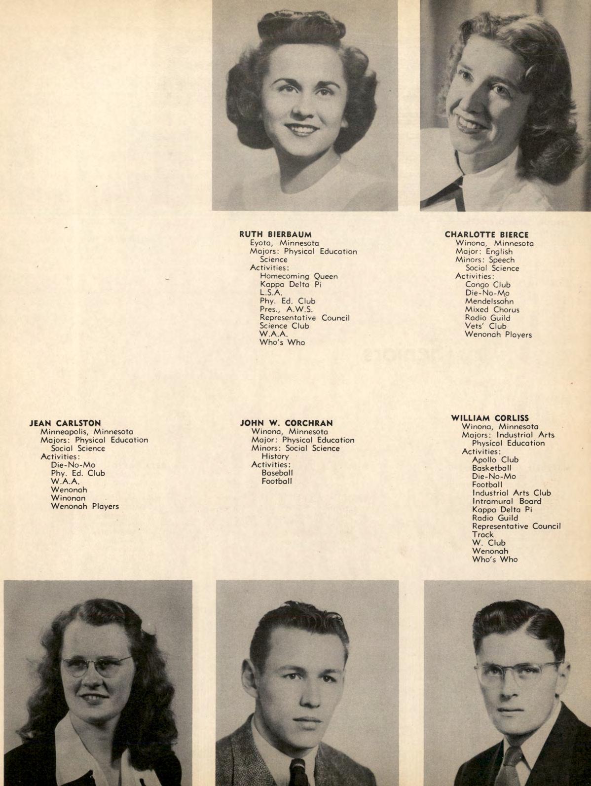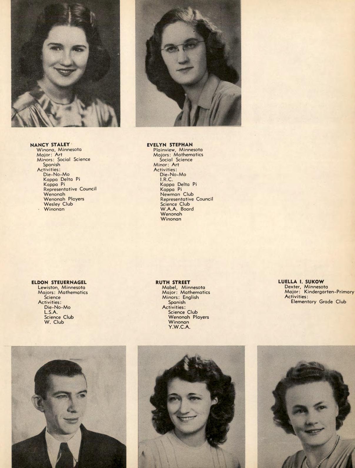 All girls have an opportunity to participate in the activities of the Women's Athletic Association. Highlight of this year was the trip to the annual Play Day at St. Cloud. Officers were Clyda Dressen, president; Ruth Bierbaum, vice president; Marion Brustuen, secretary-treasurer; and Dr. Jean Talbot and Miss Ruth Richards, advisers. These officers, with Hazel Helleck, Joyce Peterson, Lorraine Snyder, Janice Sabotta, Evelyn Stephan, and Kathryn Swanson, make up the W.A.A. board which supervises the activities.