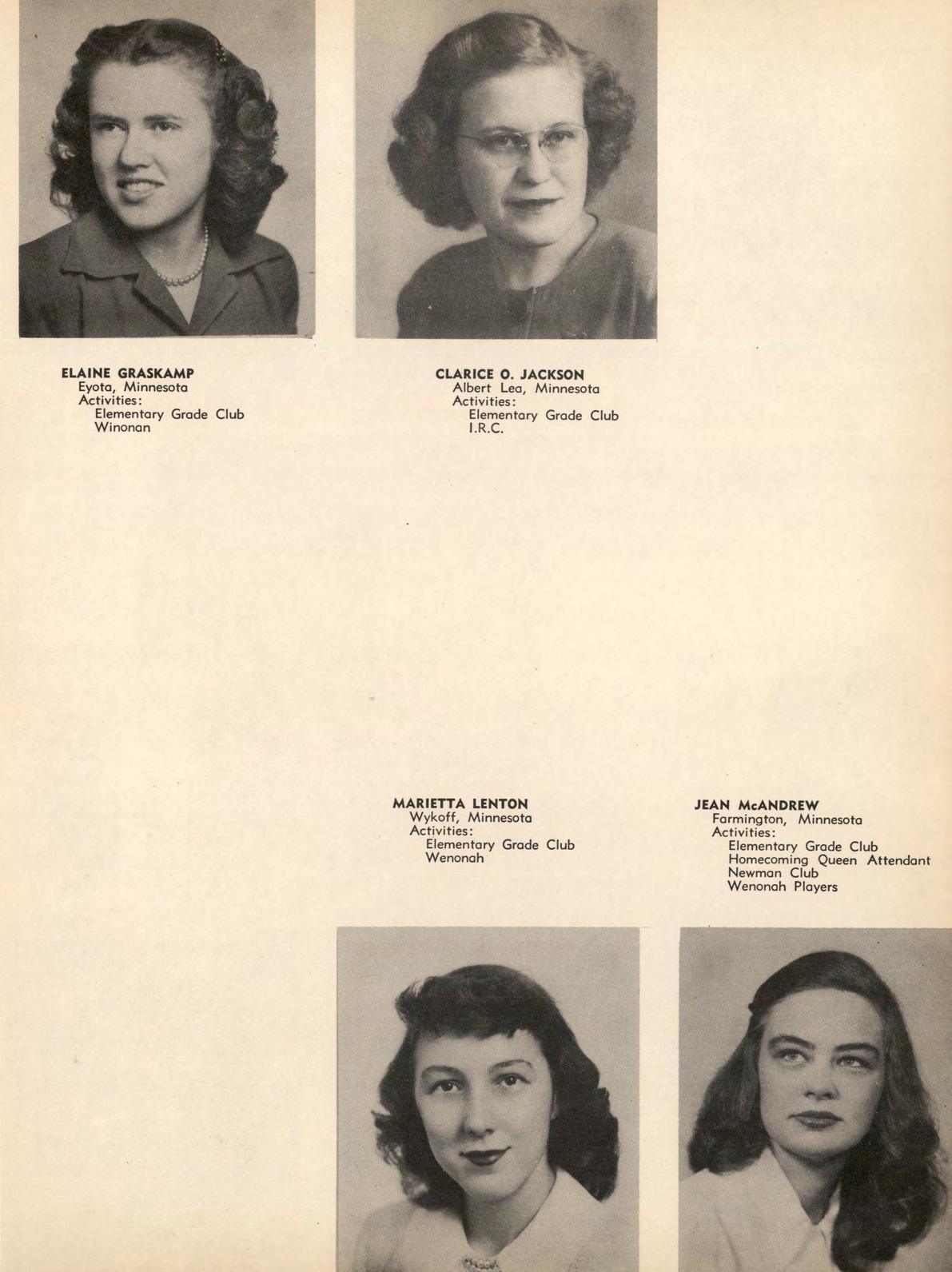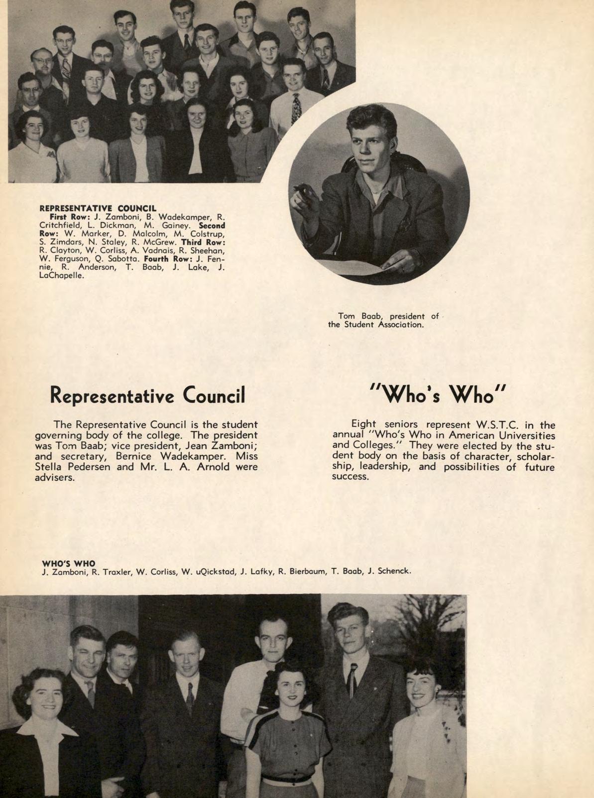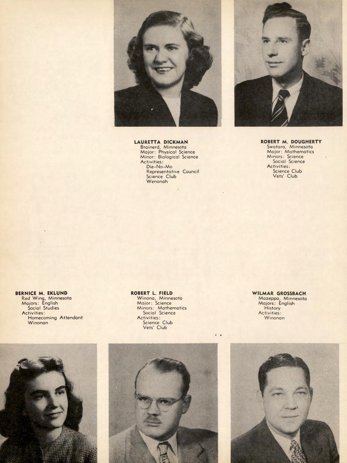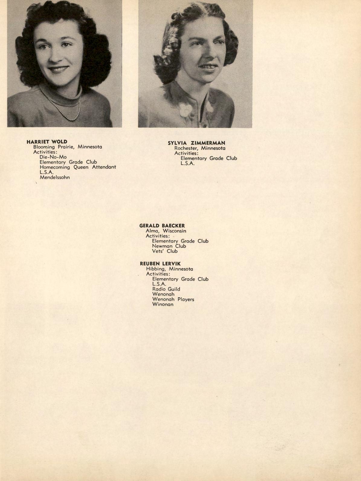 All girls have an opportunity to participate in the activities of the Women's Athletic Association. Highlight of this year was the trip to the annual Play Day at St. Cloud. Officers were Clyda Dressen, president; Ruth Bierbaum, vice president; Marion Brustuen, secretary-treasurer; and Dr. Jean Talbot and Miss Ruth Richards, advisers. These officers, with Hazel Helleck, Joyce Peterson, Lorraine Snyder, Janice Sabotta, Evelyn Stephan, and Kathryn Swanson, make up the W.A.A. board which supervises the activities.