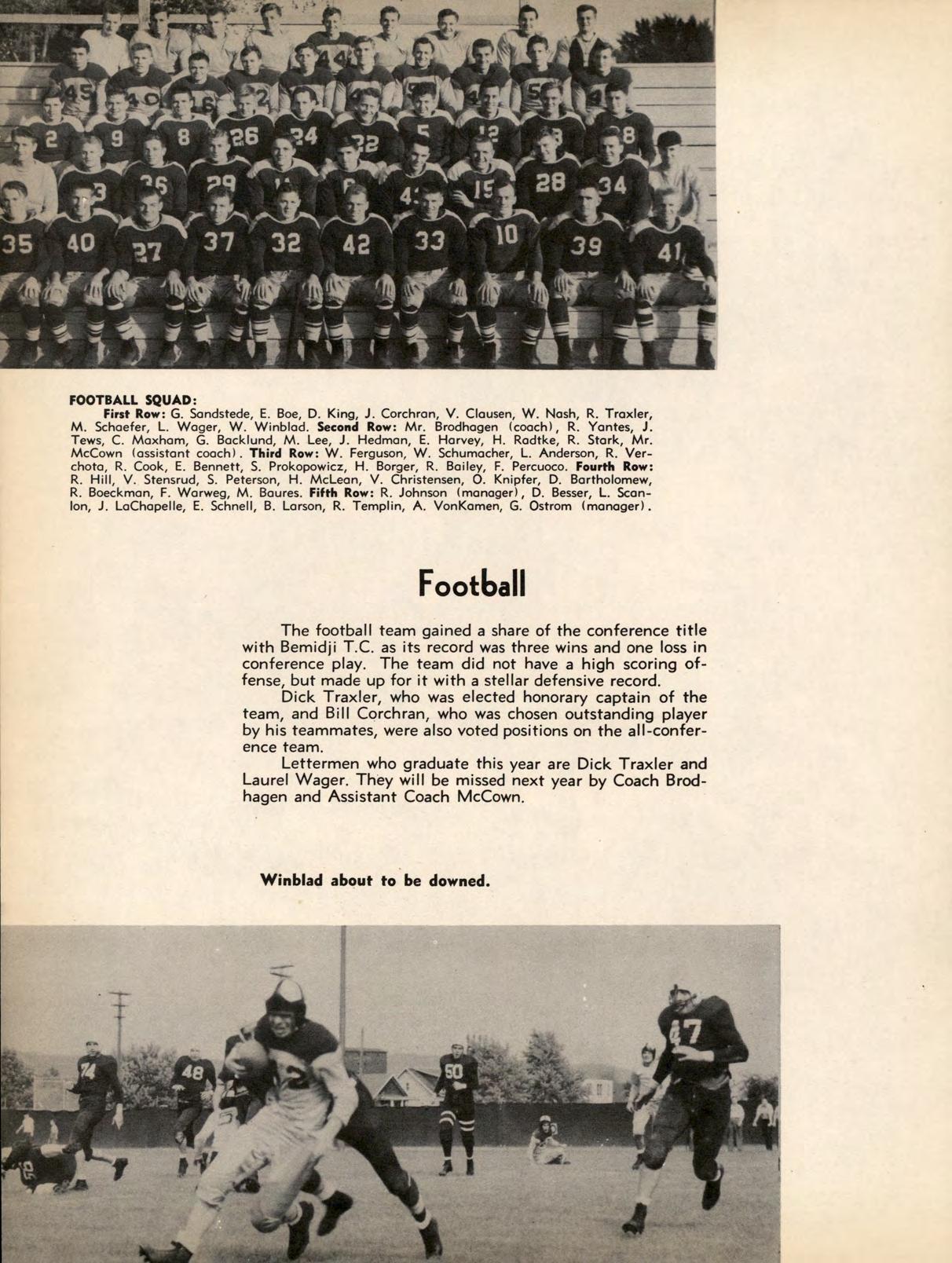The football team gained a share of the conference title with Bemidji T.C. as its record was three wins and one loss in conference play. The team did not have a high scoring offense, but made up for it with a stellar defensive record.